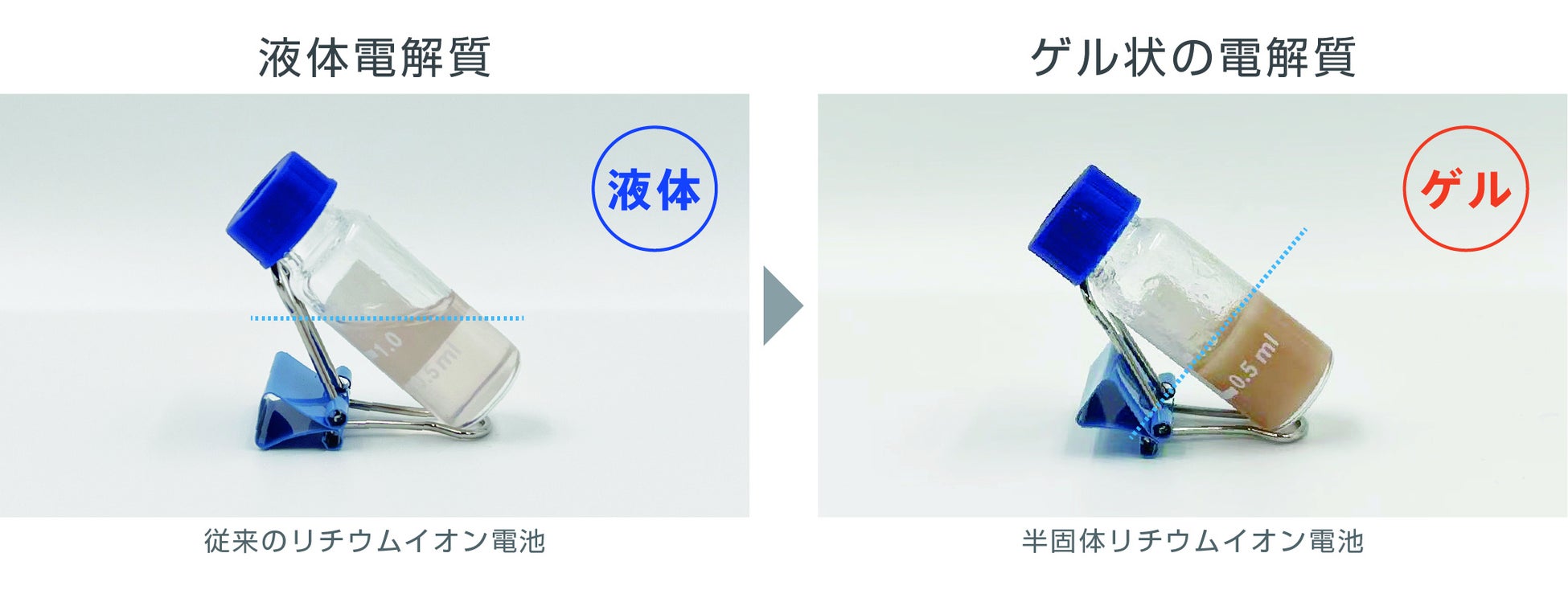 従来の電池は、電池に含まれる電解液内でリチウムイオンが正極と負極の間を移動しています。この度、製品に採用した半固体電池は、電解質を従来の液体からゲル状に変更しています。これにより可燃性成分の揮発が抑えられ、ガスが放出されにくくなるため、安全性が向上します。また、電解質以外の素材にも安全性の高い素材や加工を施すことで、総合的に安全性を高めています。