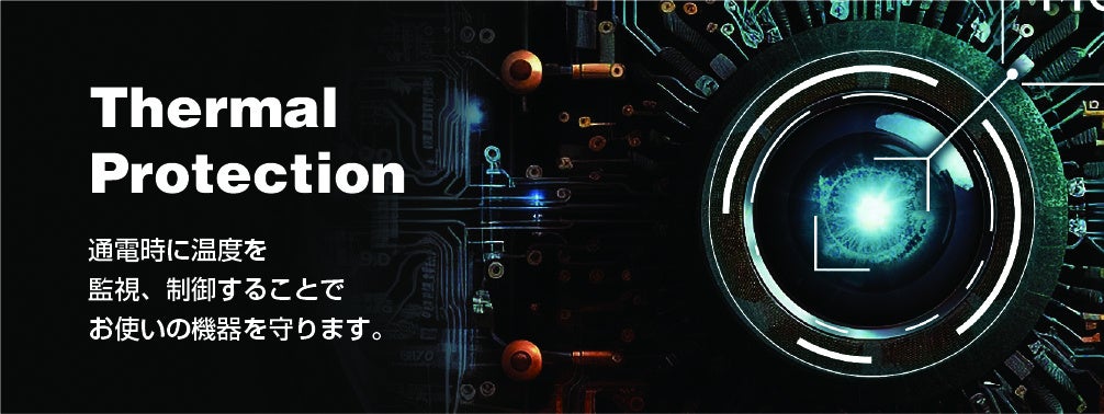 過充電・過放電・過電流防止機能および短絡保護機能と温度検知機能の5つの保護機能を備えた安心の回路設計です。さらにThermal Protectionを搭載し、通電時に温度を監視・制御することで、お使いの機器を守ります。