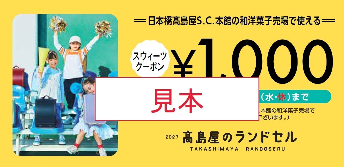 ランドセル売場でお買上げいただいたお客様に、食料品フロア(スイーツ限定)でご利用いただけるクーポンをプレゼントいたします。