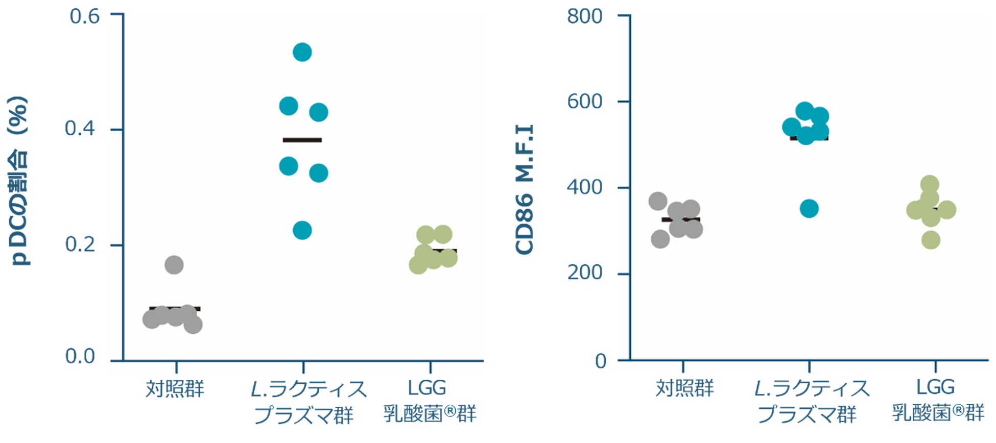「L.ラクティス プラズマ」経鼻接種群はLGG乳酸菌®経鼻接種群と比較し、最終経鼻接種から6時間後に鼻組織由来細胞においてウイルス感染防御に重要な免疫細胞であるpDCの割合増加や活性化マーカー(CD86)の発現増強、抗ウイルス遺伝子の発現増強が認められました。