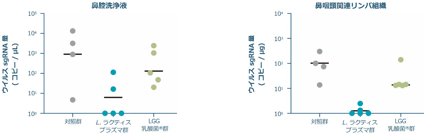 また、「L.ラクティス プラズマ」経鼻接種群はLGG乳酸菌®経鼻接種群と比較し、鼻組織において新型コロナウイルスの増殖を抑制することを確認しました。