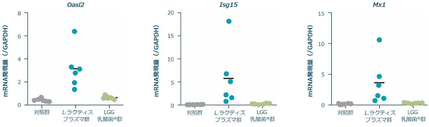 これらの研究結果から、「L.ラクティス プラズマ」経鼻接種によるウイルス増殖抑制効果に関する作用機序の一部として、鼻組織でのpDC誘因および活性化、ならびに抗ウイルス遺伝子発現の増強を介している可能性が示唆されました。