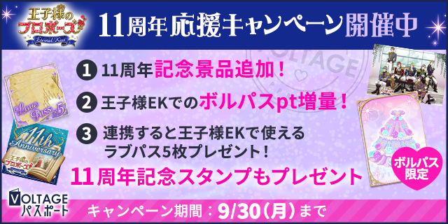 毎日の胸きゅんが貯まる!無料会員ポイントサイト「VOLTAGEパスポート」(以下、「ボルパス」)にて「王子様のプロポーズ Eternal Kiss」アニバーサリー応援キャンペーンを開催しております。この機会にぜひ「ボルパス」でもお得にお楽しみください。