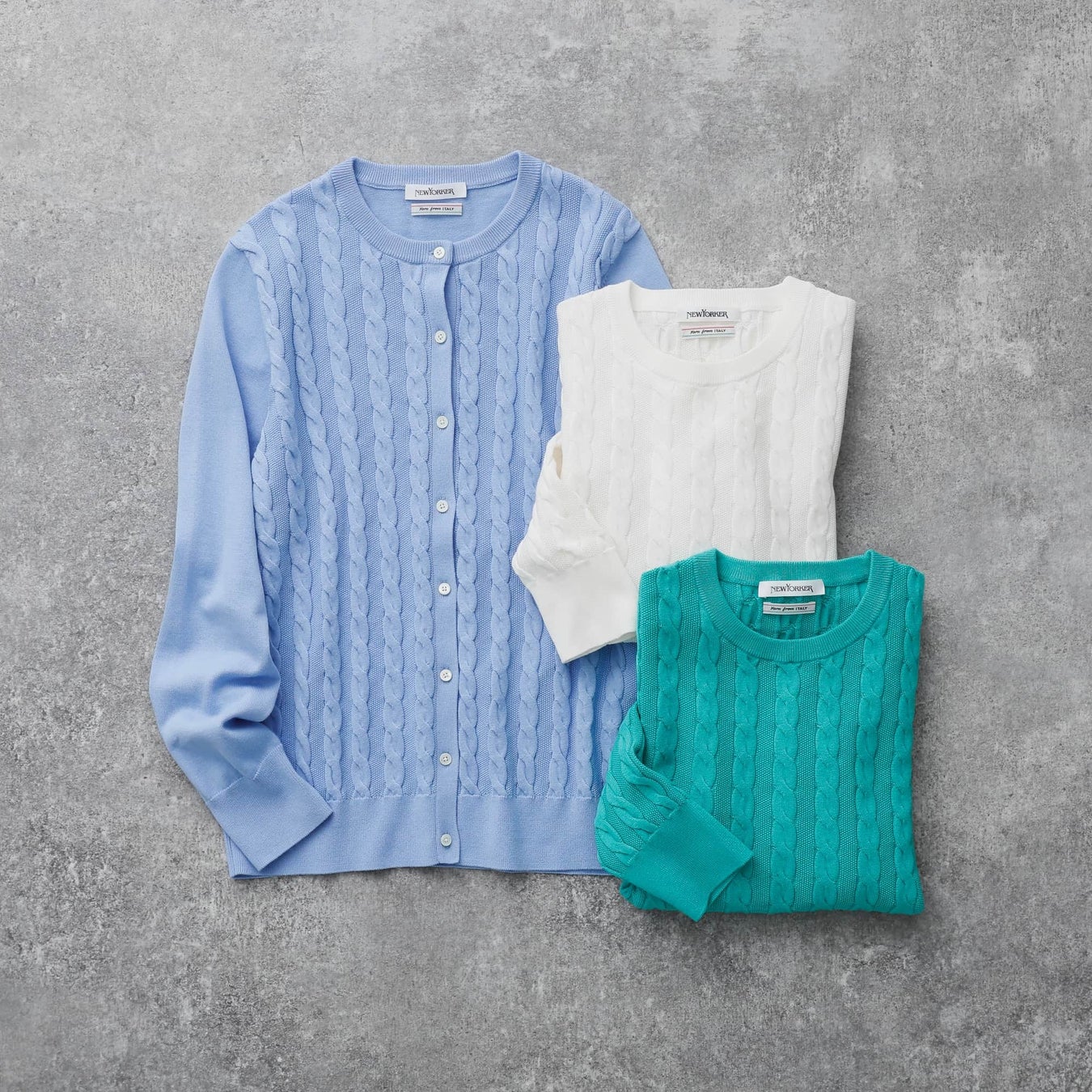 春のトラッドスタイルには欠かせないケーブル柄のニット。上質な素材と着心地の良さにこだわり、長くご愛用いただけるベーシックな1枚に仕上げました。