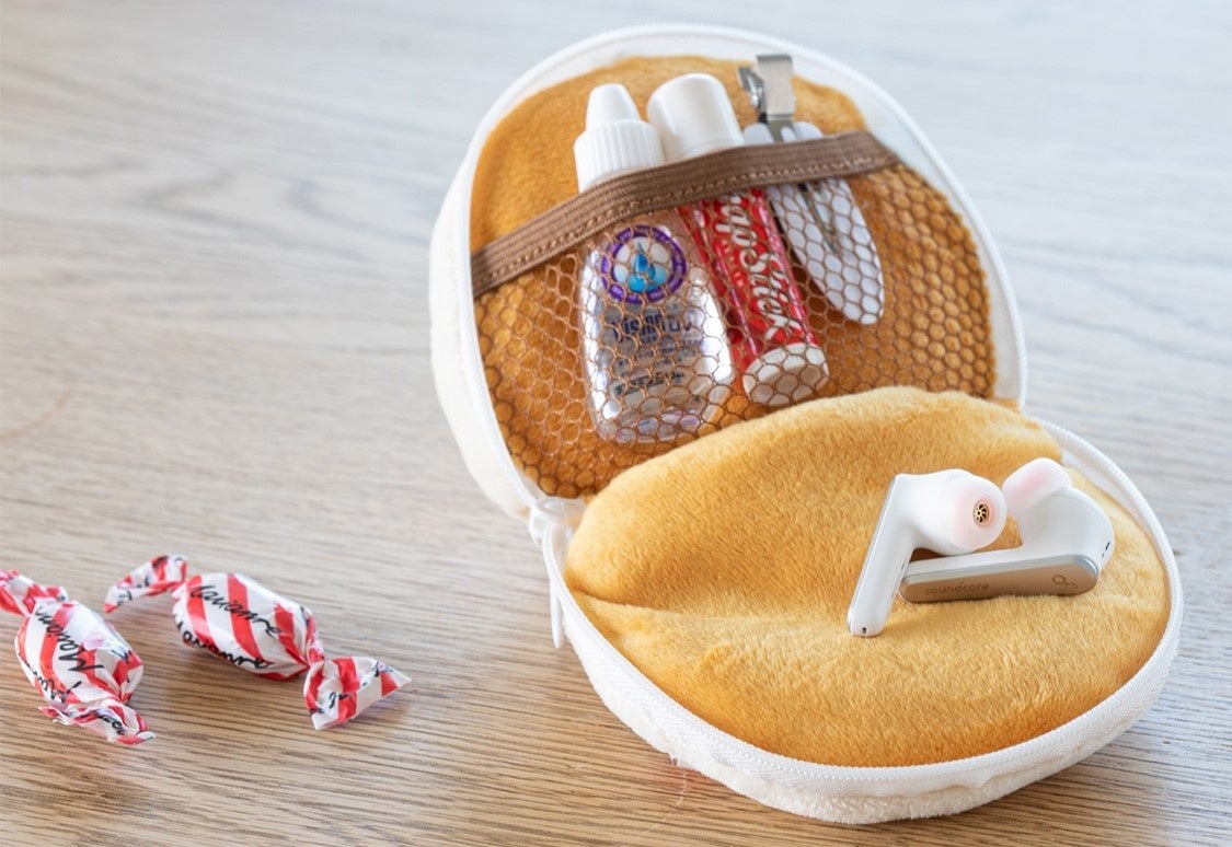 中村屋の肉まんそっくりなポーチは、見た目のインパクト大で、思わずかじりたくなるほどふっかふか! ポーチの中にはネットポケットがついていて、目薬やリップ、イヤホンなどの小物を収納するのに最適です。また、底面には肉まんの敷き紙風のポケット付きで、交通系ICカードなどを入れられて便利。さらにフック付きなので、バッグにチャームとしてつければ、目を引くこと間違いなし!