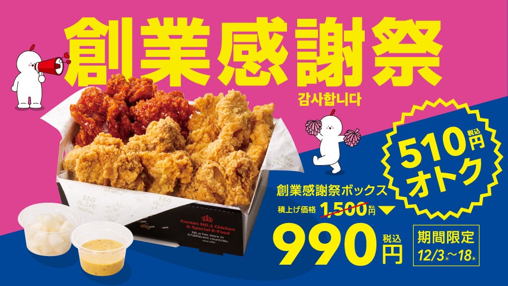 ワタミ株式会社(本社:東京都大田区、以下ワタミ)が国内で運営する、韓国No.1 フライドチキンブランド『bb.q オリーブチキンカフェ(以下、オリーブチキンカフェ)』は、12月3日(火)~18日(水)の期間限定で「創業感謝祭ボックス」(990円税込)を販売いたします。