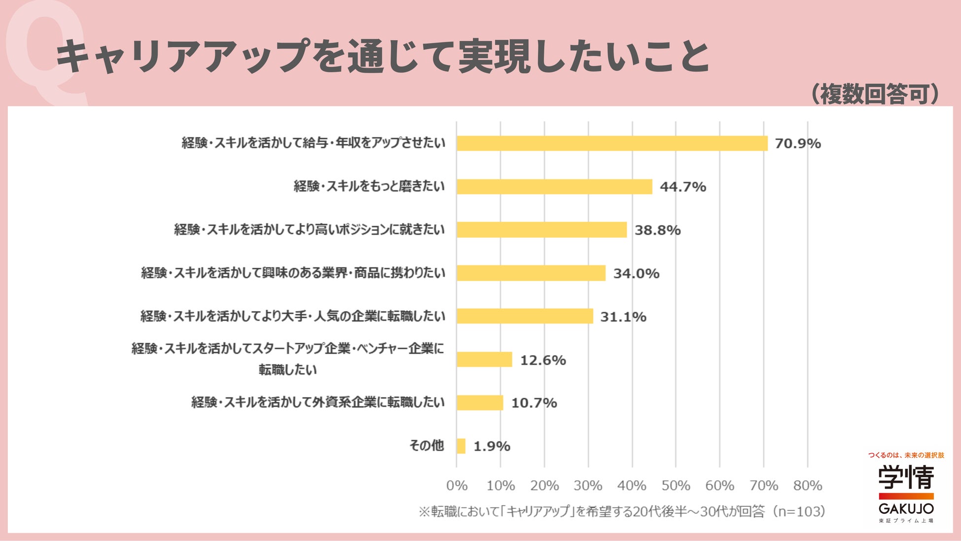 キャリアアップを通じて実現したいことは「給与・年収をアップさせたい」が70.9%で最多。次いで、「経験・スキルをもっと磨きたい」44.7%、「より高いポジションに就きたい」38.8%が続きました。
