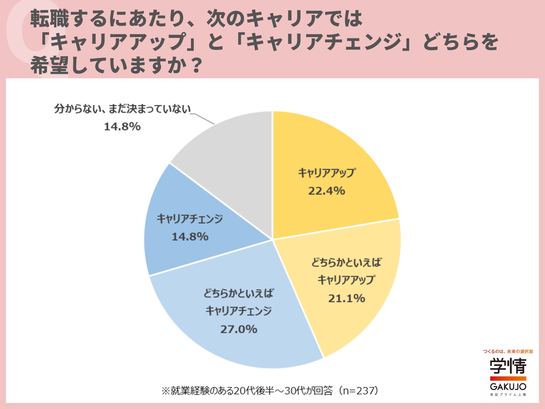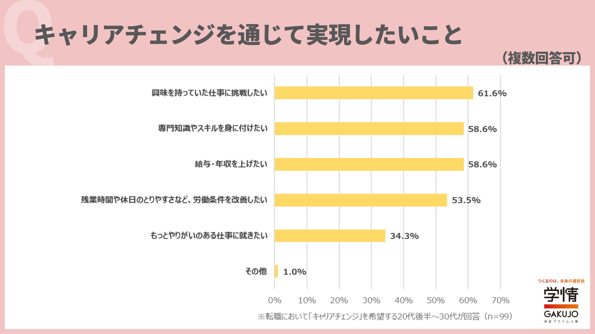 株式会社学情(本社:東京都中央区)は、20代後半~30代の仕事観や働く意識をひも解くために、アンケート調査を実施しました。今回は、「転職で実現したいこと」に関して調査。転職において、20代後半~30代は「キャリアアップ」の希望者がやや多い傾向であることがわかりました。また、「キャリアアップ」を通じて実現したいことは、「給与・年収アップ」の回答が最多。次いで、「経験・スキルをもっと磨きたい」、「より高いポジションに就きたい」が続きました。一方、「キャリアチェンジ」を通じて実現したいことは、「興味を持っていた仕事に挑戦したい」が最も多くの回答を集めました。「専門知識やスキルを身に付けたい」と「給与・年収を上げたい」がいずれも58.6%で、同率2位となっています。