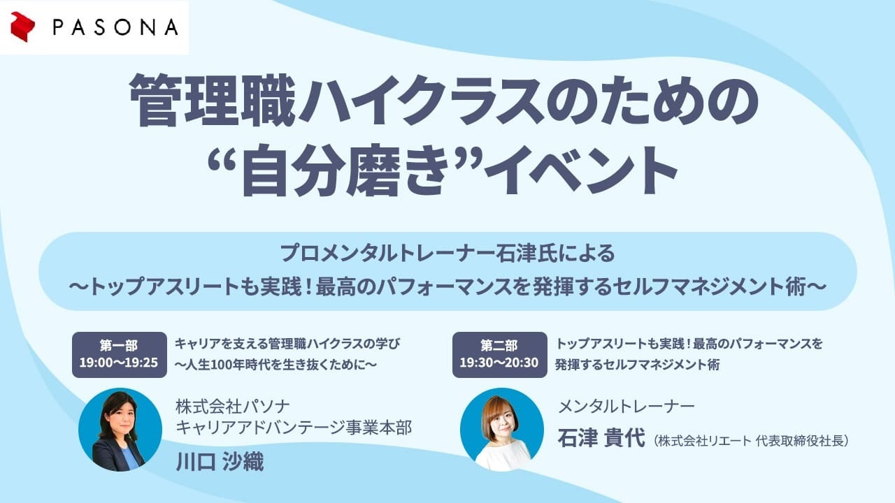 株式会社パソナ(本社:東京都千代田区、代表取締役社長 中尾慎太郎)は、個人向けマンツーマン・プロフェッショナル・マッチングサービスを提供する株式会社プロフェリエ(本社:東京都港区、代表取締役 澤村昭夫)と連携し、オンラインセミナー『管理職ハイクラスのための“自分磨き”~トップアスリートも実践!最高のパフォーマンスを発揮するセルフマネジメント術~』を11月29日(火)に開催いたします。