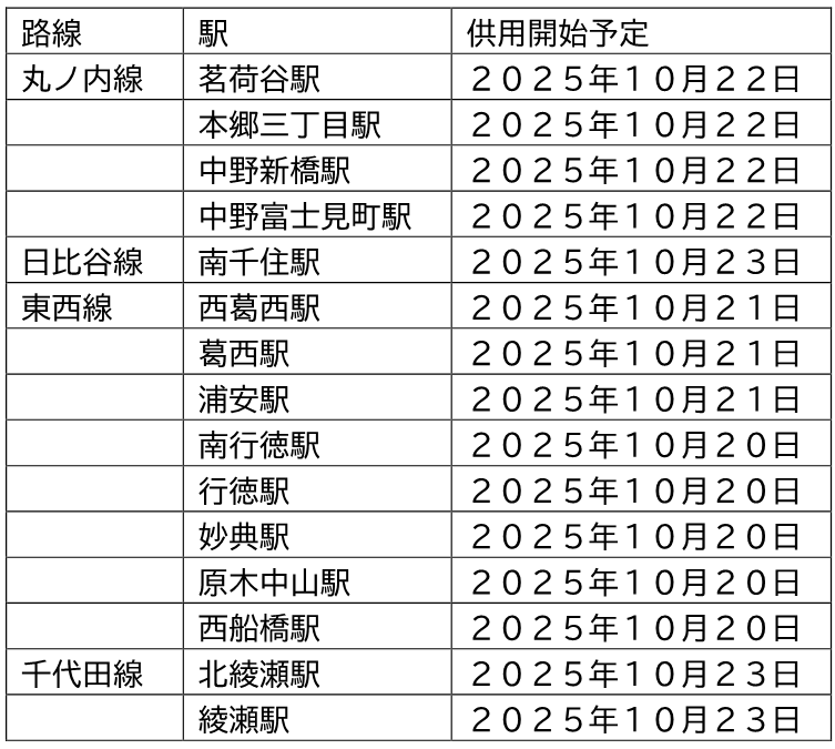 2025年度中には、ビジネスやショッピング、観光など、さまざまなシーンで多くのお客様にご利用いただけるよう、大手町や銀座、浅草エリアへの設置拡大を順次予定しています。引き続き、東京メトロ全駅※への展開を目指し、誰もが気軽に利用できる環境づくりを進めていきます。