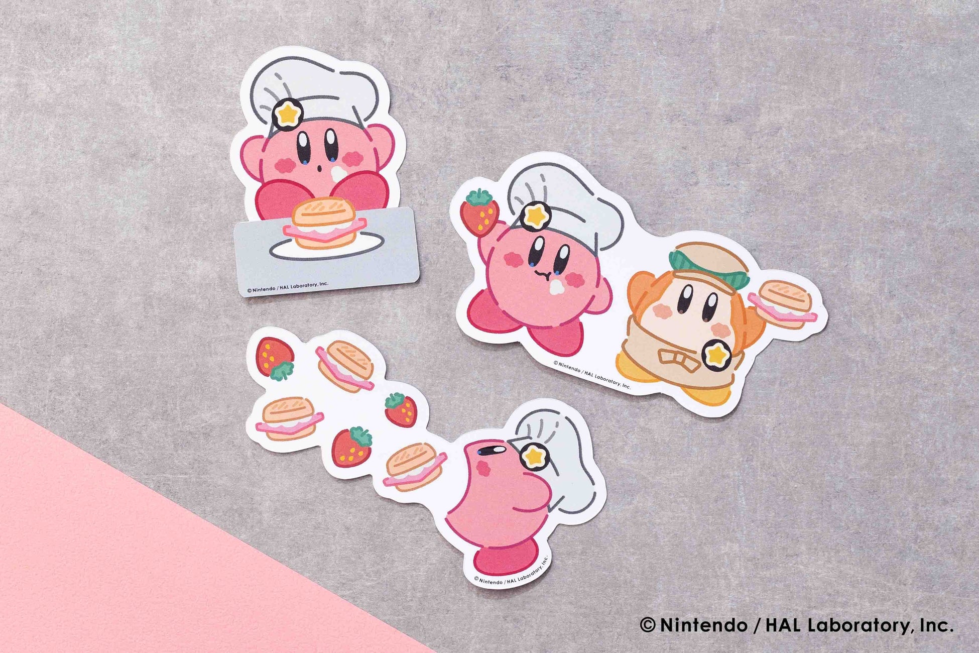 コラボを記念してデザインされた、スイーツバーガーを持つワドルディといちごをつまみ食いするカービィのイラストは、いつまでも見ていたくなるかわいさ。さらに箱の中には、3種類のオリジナルステッカーがランダムで1枚入っています。何が出るかは開けてみてのお楽しみ♪