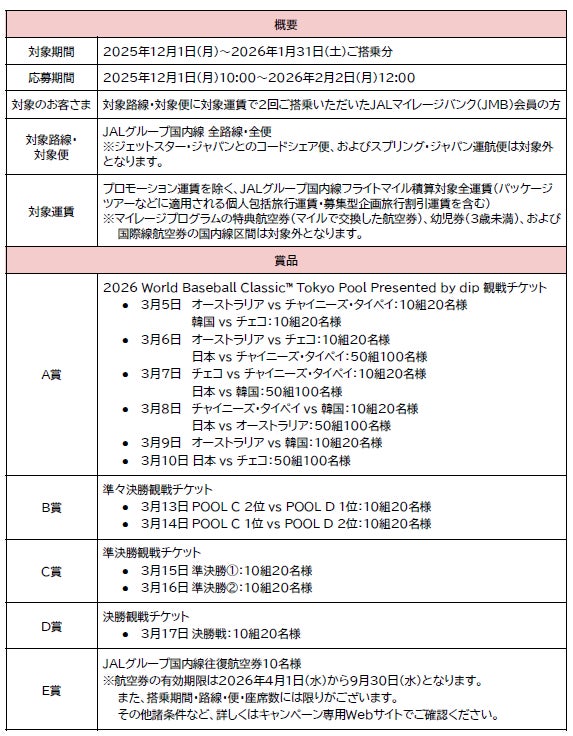 本契約締結に伴い、2025年12月から2026年1月の対象期間中にJALグループ国内線に2回ご搭乗いただくと、抽選で東京プールの観戦チケットなど豪華賞品が当たる「JAL 2026 World Baseball Classic™搭乗キャンペーン」を実施します。年末年始のご旅行・ご帰省など、ぜひこの機会にJALグループ便にて全国各地へお出かけください。