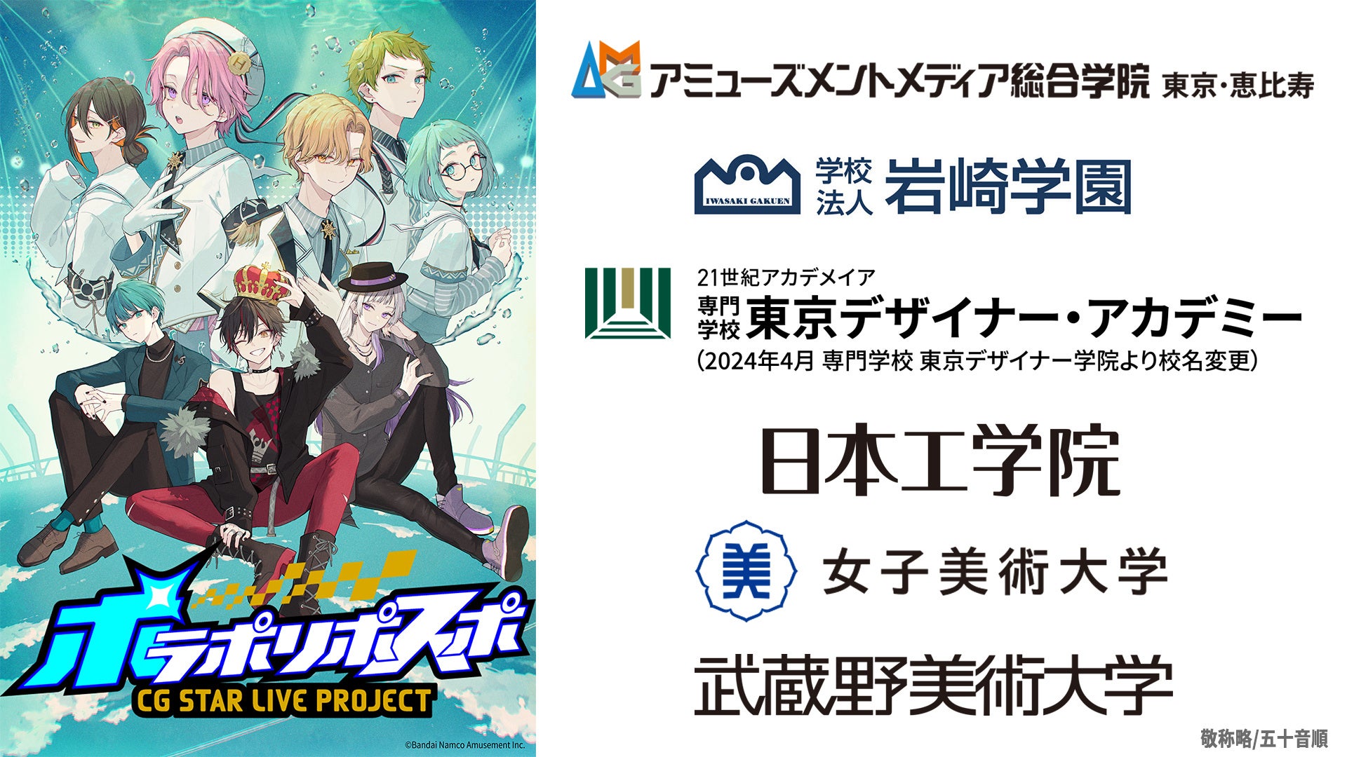 「ポラポリポスポ」はファンとともにキャラクターやコンテンツを成長・変化させていくプロジェクトです。長く愛されるIPを確立することを目的にバンダイナムコアミューズメントが企画開発し、現在は2組のCGキャラクターバンドが活動中です。従来キャラクターコンテンツでは公開することの少ない制作の「裏側」を積極的に公開することで、各分野のプロフェッショナルの仕事への敬意を表し、キャラクターに関わるさまざまな仕事の認知や理解を広げるとともに、未来を担う若手クリエイターとの取り組みを積極的に行っています。今回の産学連携は、将来のクリエイターを育成支援し、長く愛されるコンテンツの制作だけではなく、リアルエンターテインメントの未来づくりに寄与する目的で、参画する各校に向けて授業の一環として活用できるカリキュラムを提供します。