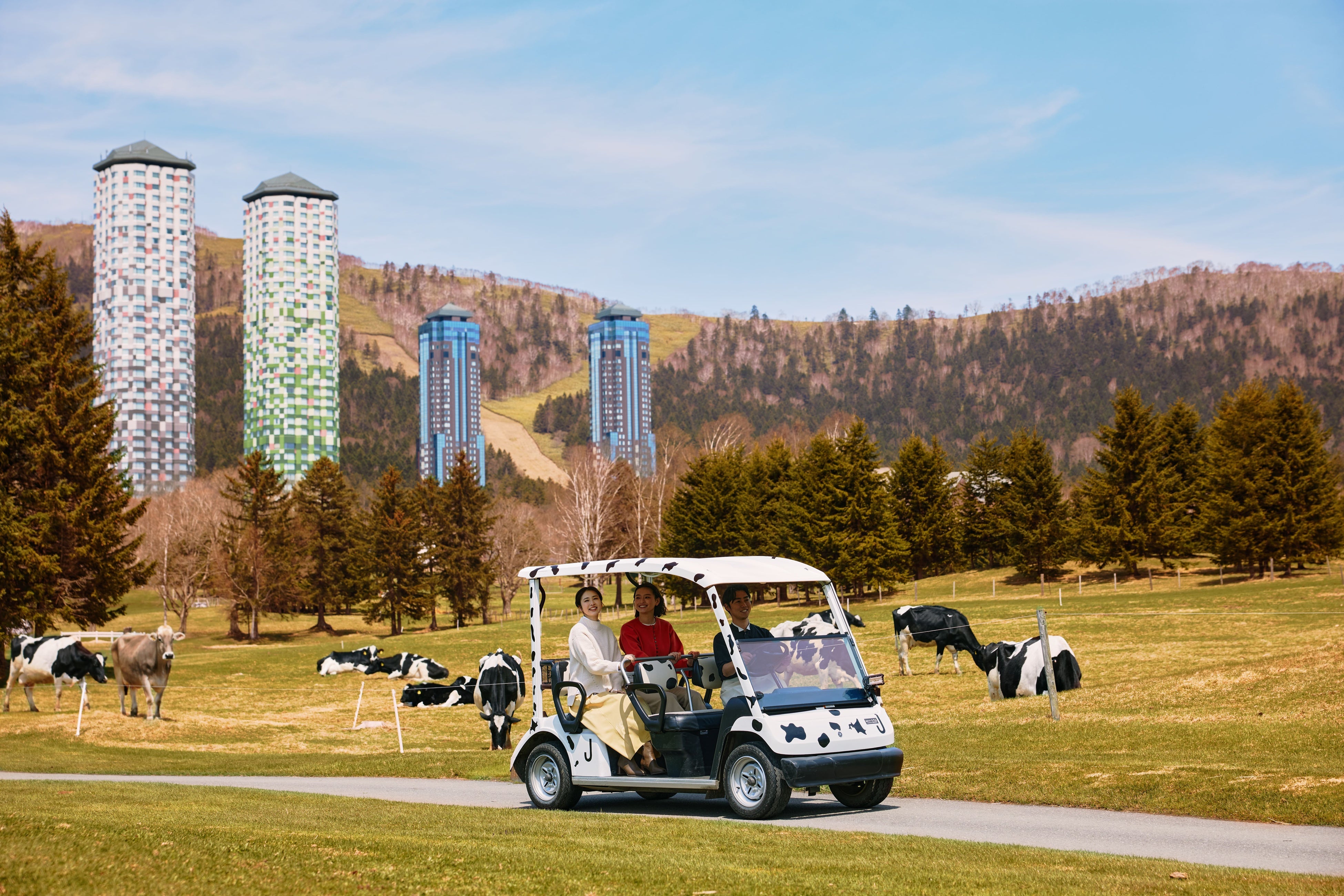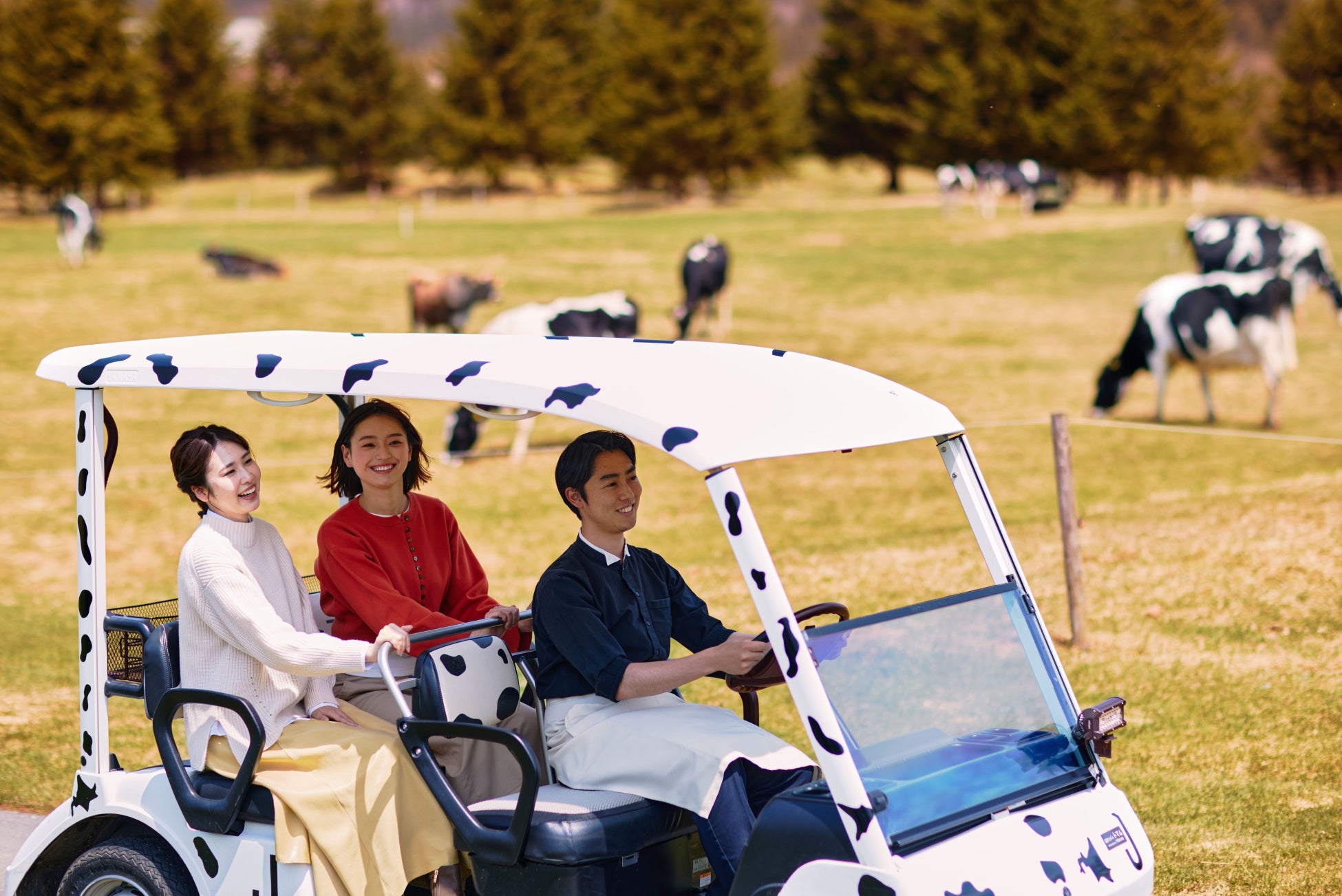 ファームアフタヌーンティーを体験する前に、約100ヘクタールの広大なファームエリアを、コンシェルジュがカートに乗って案内。「ファーム星野」の乳牛や乳製品についての話を聞きながら、白樺の黄葉が揺れ、広大な牧草地で牛がのびのびと過ごす穏やかな風景に出会えます。エリアを巡った後は、秋の澄んだ空気と北海道の自然を感じながら、ゆったりとアフタヌーンティーを楽しめます。