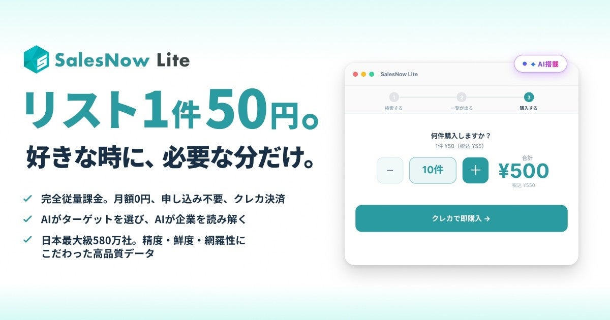 月額0円・1件50円で580万社+の法人データをスポット購入可能な新サービス「SalesNow Lite」を正式リリース