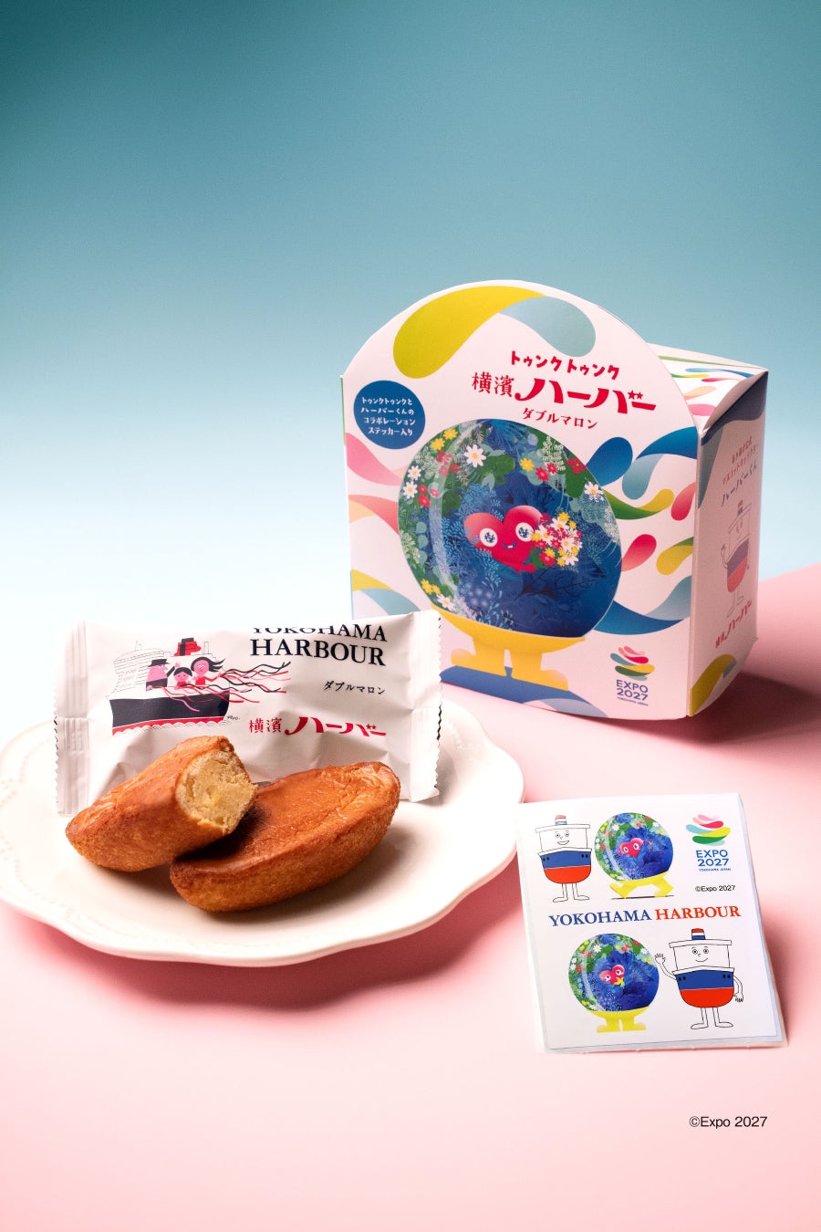 2027年国際園芸博覧会開催1年前を記念した、公式マスコットキャラクター「トゥンクトゥンク」とありあけ公式キャラクター「ハーバーくん」のコラボパッケージ。港・ヨコハマの船をイメージし伝統の製法で焼き上げた贅沢なマロンケーキ「ダブルマロン」4個入り。