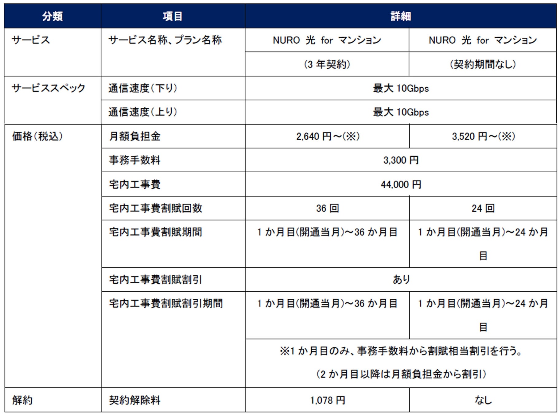 ・宅内工事費44,000円の割賦と同等額を契約事務手数料または月額負担金から割引