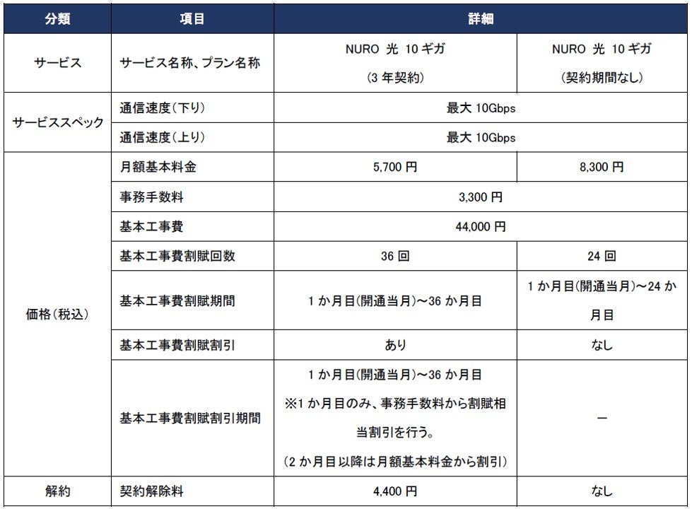 宮城県での提供プランは、「NURO 光 10ギガ」、「NURO 光 for マンション 10ギガ」です。最大通信速度が上り/下りともに10Gbpsの高速・大容量サービスをリーズナブルな価格で提供します。一例として、NURO 光 10ギガ(3年契約)プランの場合、月額基本料金は5,700円(※)です。また、初年度の月額基本料金が980円となる特典など(※)も適用します。
