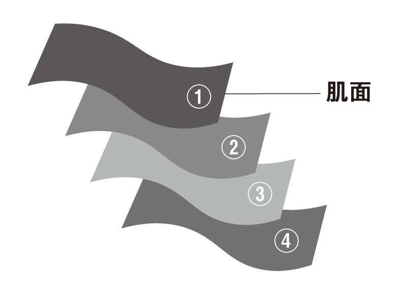 ②吸水帯:水分を吸収、保水し、気になる臭いを防ぎます ※吸水量はアイテムによって異なります③・④防水布:透湿防水フィルム③と高密度撥水素材④で水分の漏れを防ぎます