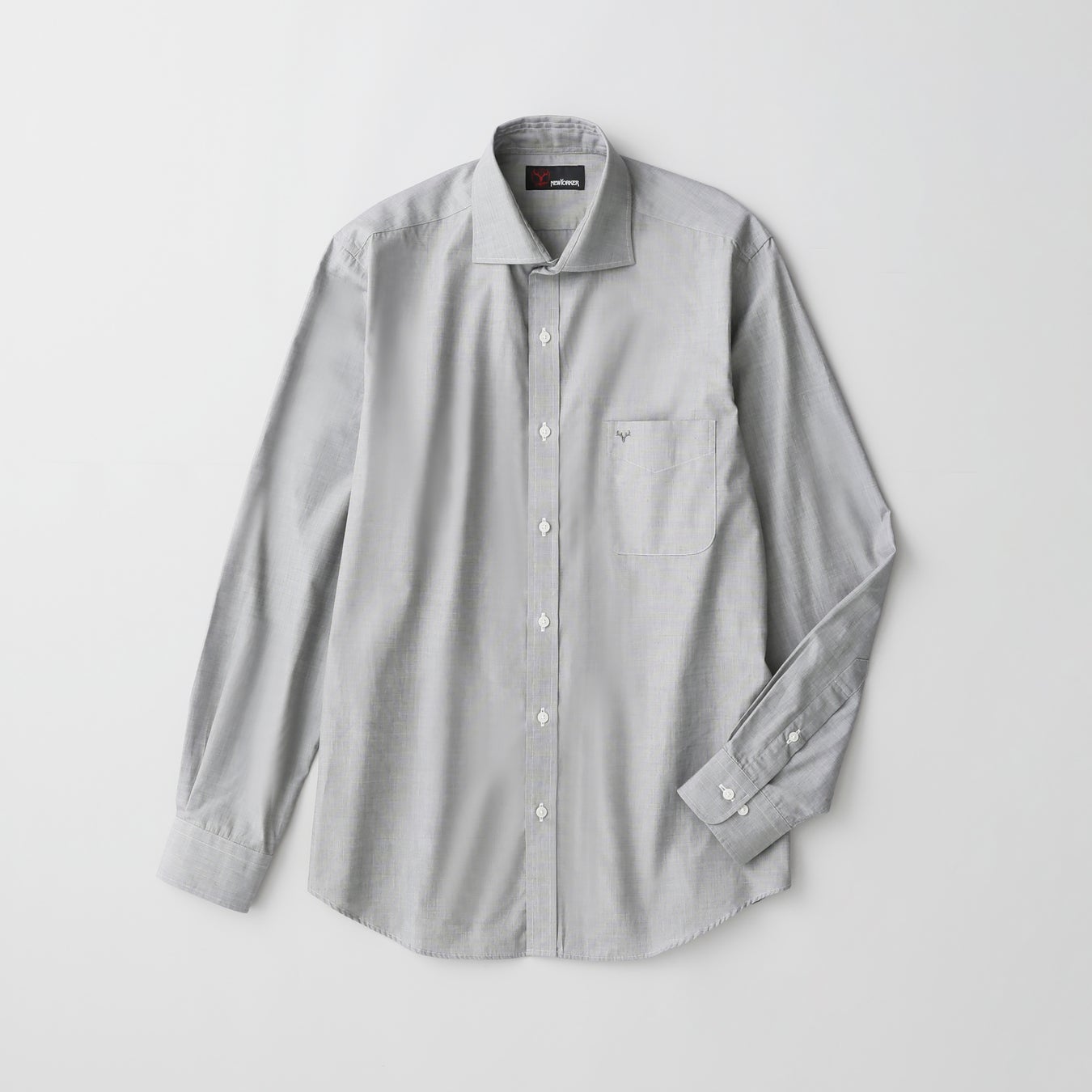 グレーとホワイトで構成した無地のワイドカラーシャツ。素材には肌触りの良いコットン100%を使用。柔らかく快適な着心地を実現します。グレーの無地は上品な落ち着いた印象を与え、今シーズンのジャケットやネクタイとの相性も抜群です。胸ポケットにはチームマークの「Antler」をグレーの刺繍で施しています。