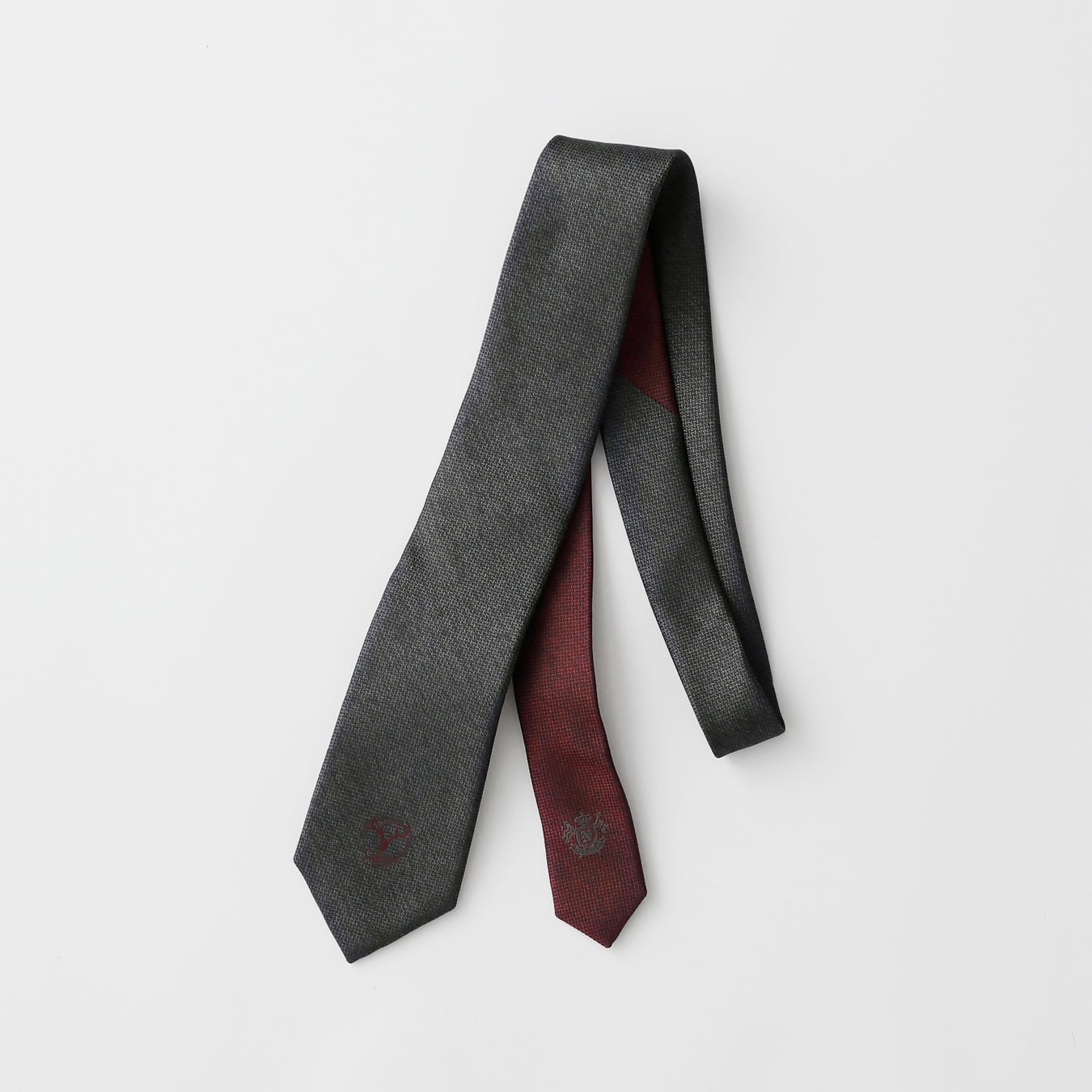 大剣にはチャコールグレーでAntlerを配し、小剣にはアントラーズレッドでNEWYORKERクレストを組み合わせたシックなクレリックネクタイ。落ち着いたカラーリングで、大人の優雅な雰囲気を醸し出します。結び目から大剣と小剣の柄違いが見え隠れすることで、スタイリングのワンポイントアクセントにも。剣先裏にはチームカラーのアントラーズレッドに「Antler」ロゴを施しております。