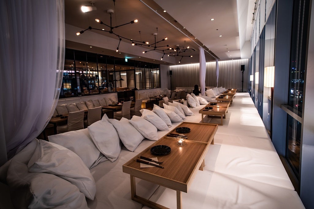 メインフロアは、一面のガラス窓から人々が行き交う秋葉原の街の賑わいを望むことができる小上がり座敷と、
