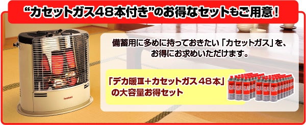 通常セットがカセットガス9本付きのところ、48本付きにした『デカ暖Ⅲ 大容量お得セット』をご用意いたしました。