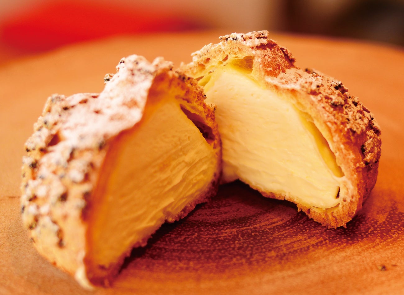 2 層に焼いたサクサクのシュー生地に、新鮮なヤギミルクで作ったカスタードクリームをたっぷりと詰めたシュークリーム。