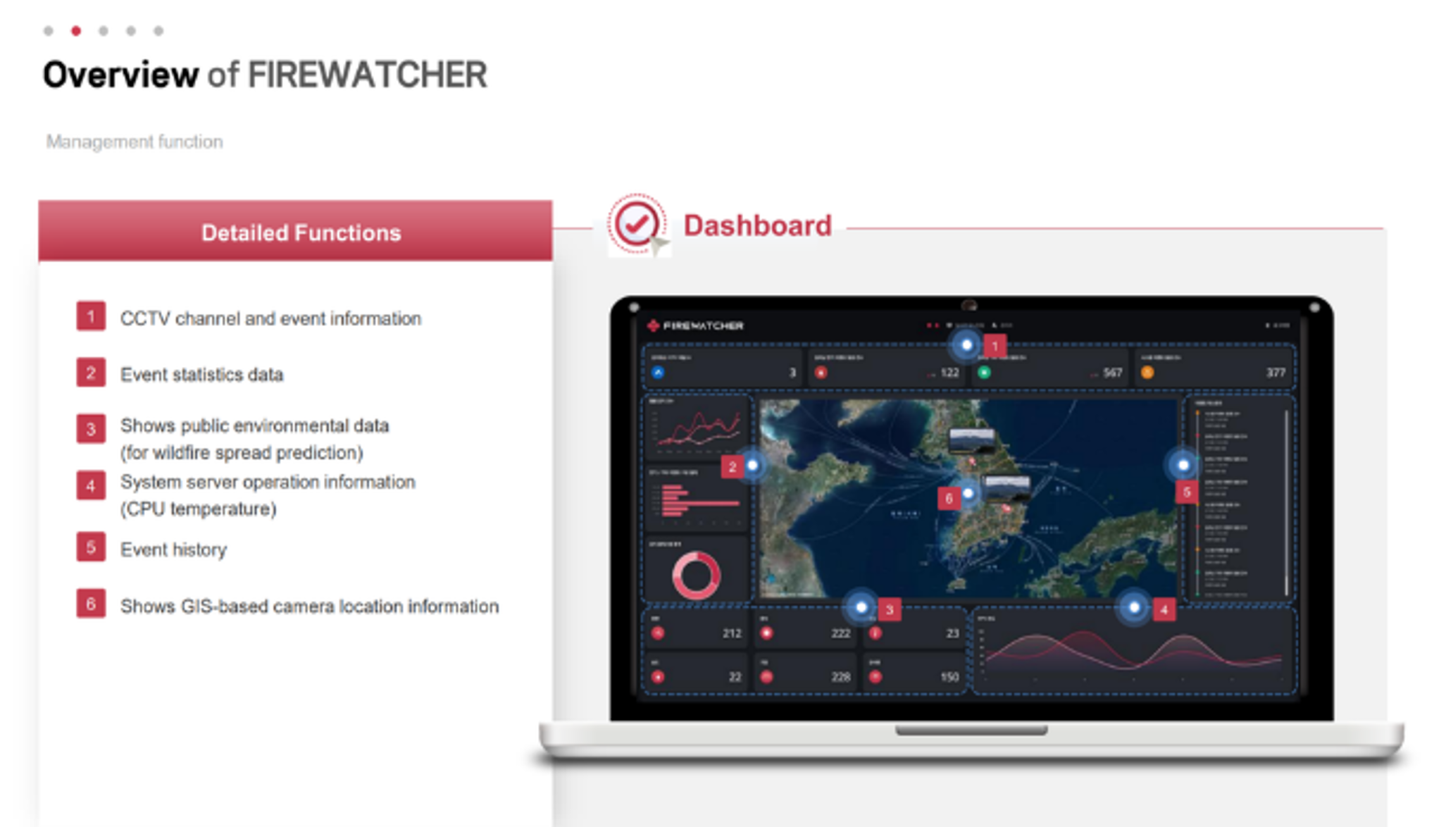 ディープラーニング画像 (ビデオ) 解析技術を通じて煙と火災を感知し、早期鎮火を支援するインテリジェントな山火事状況分析システムです。 FIREWATCHER はリアルタイムの煙検知と山火事の位置推定機能を提供しており、すでに韓国国内市場の 80% 以上を独占しています。