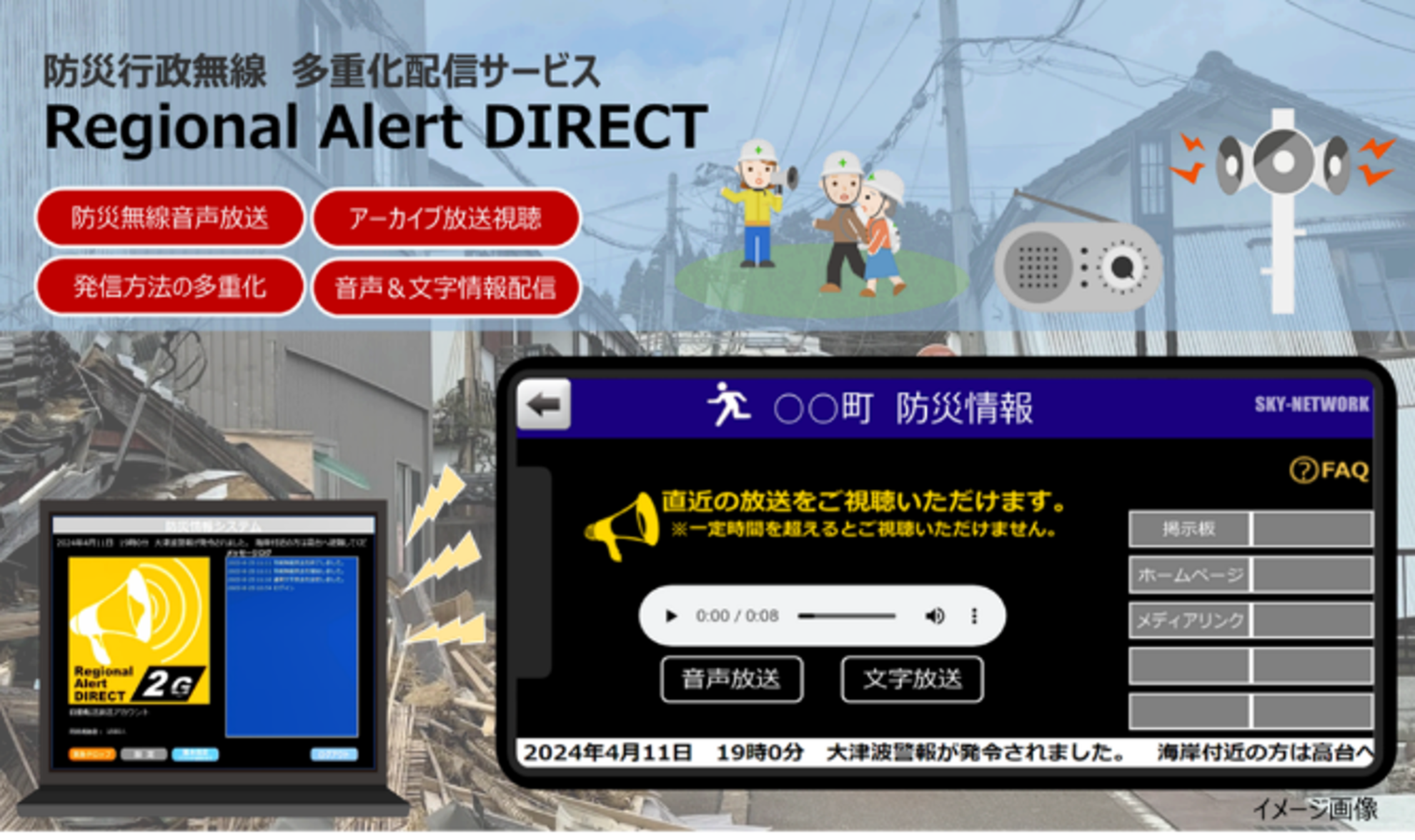 主な機能①:防災行政無線の音声を自動でアプリへ配信 ➁:PCやスマートフォンで防災情報配信 ③:文字情報の配信が可能 導入前の課題:放送設備の故障、放送音声が環境に左右されやすく聞き取りにくい、外出時に情報が得られない 提供価値:地域の防災無線情報を音声と文字で住民のスマートフォンに届けます