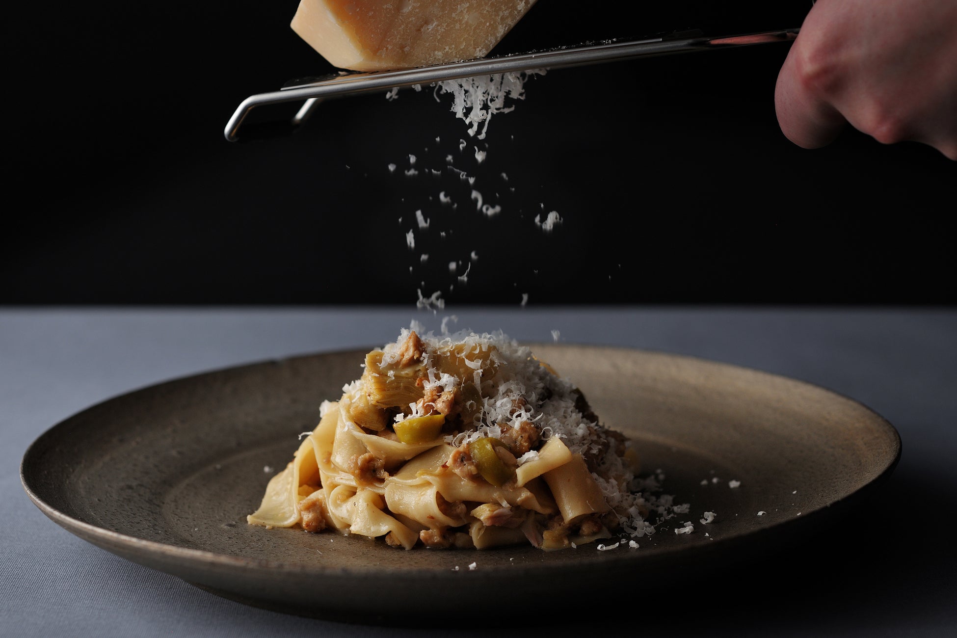 リボン状の平打ち麺であるパッパルデッレに、タマネギやセロリなどの香味野菜、ハーブ、ラパンブロード(*)で煮込んだラパンラグーを絡め、松の実やアーティチョークと合わせました。仕上げにかけるパルミジャーノ・レッジャーノと混ぜ合わせることで、ラパンラグー独特の旨みをより一層味わうことができます。