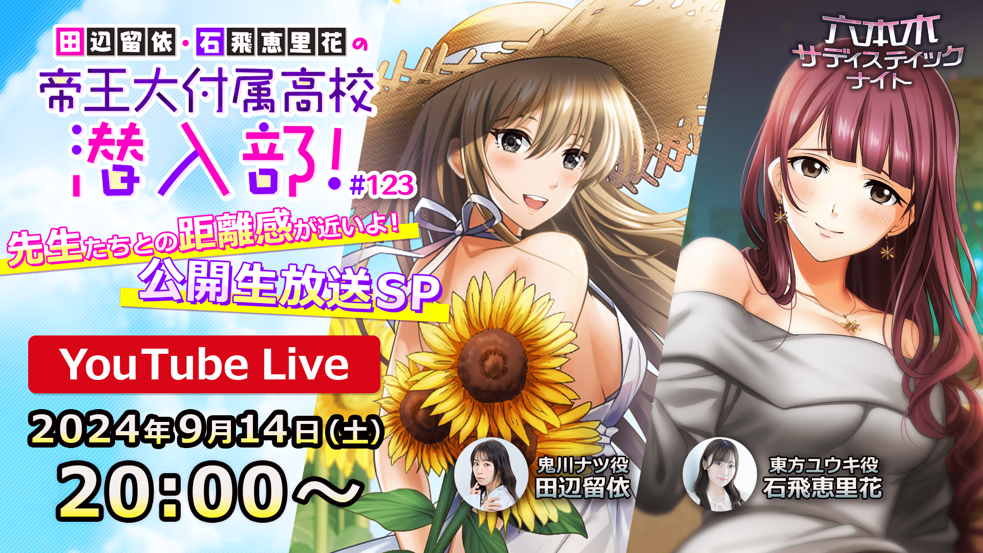 「六本木サディスティックナイト」田辺留依さん・石飛恵里花さん出演 公式YouTube番組公開生放送を9月14日(土)に東京・渋谷にて開催チケット好評販売中!