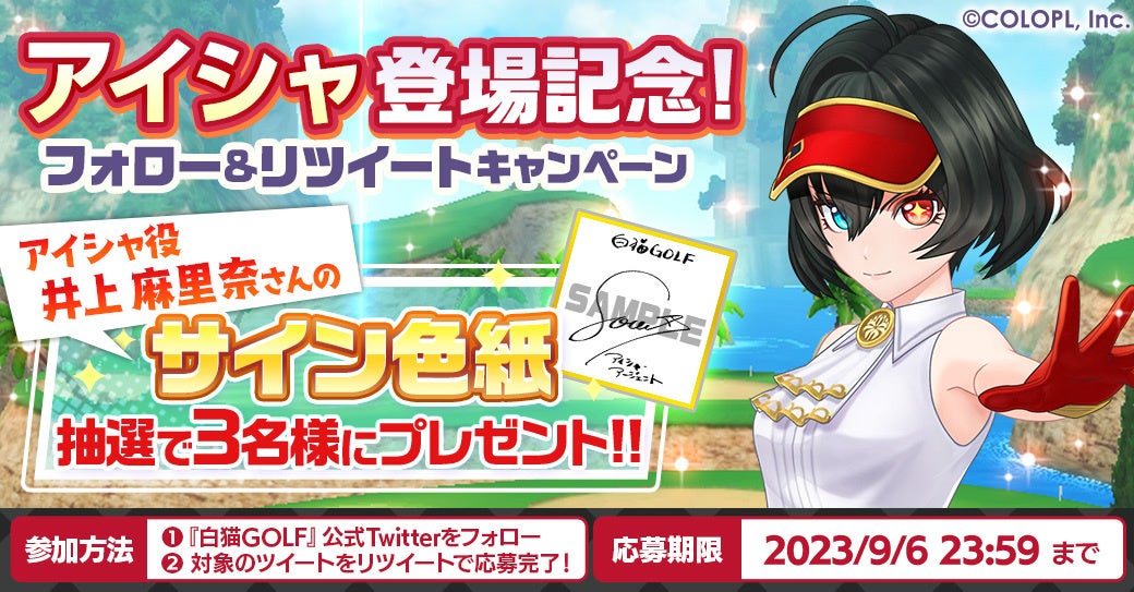 本日8月31日(木)16:00より、新ゴルファー「アイシャ(CV:井上 麻里奈)」が登場しました。新ゴルファー登場を記念した新たなショートPVも公開中ですので、そちらもぜひご覧ください。合わせて公式X(Twitter)では、「アイシャ」のキャラクターボイスを担当する井上麻里奈さんの「サイン色紙」が抽選で当たるキャンペーンも開催中です。