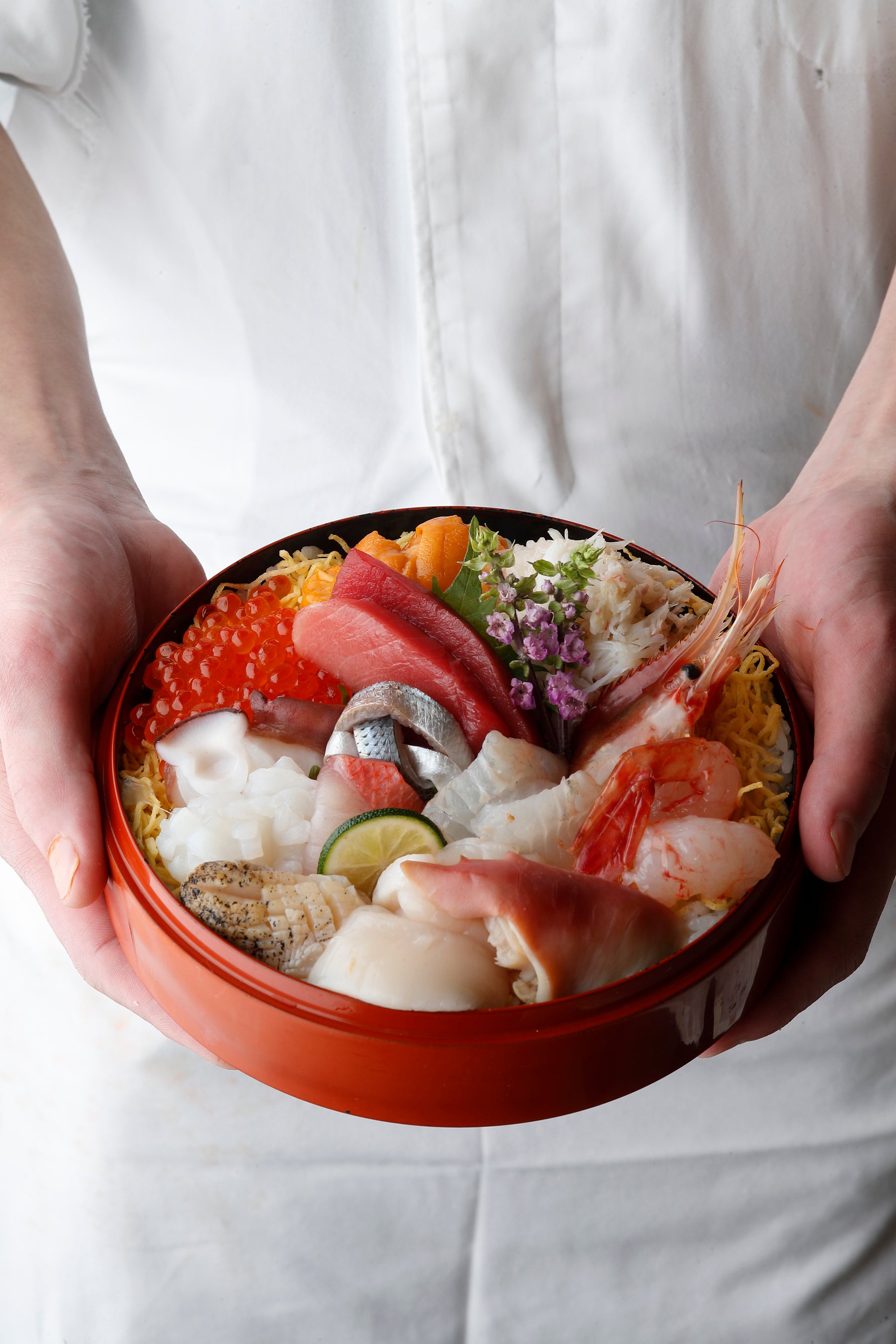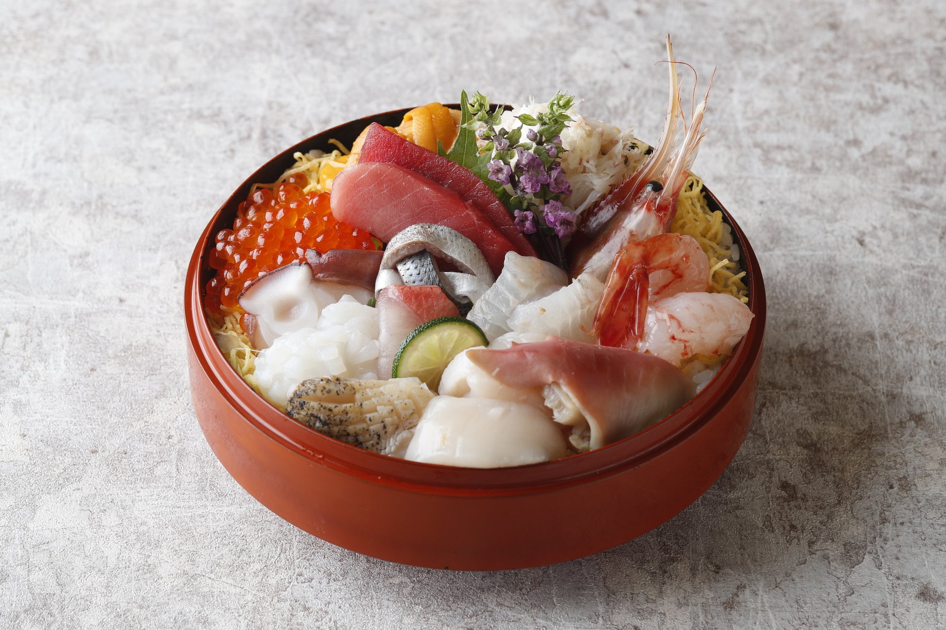 北海道で水揚げされた海産物をふんだんに用いた海鮮丼をご用意します。八角など漁獲量の少ない直送ならではの海鮮をはじめ、北海道の味覚の代表である甘くとろける雲丹、肉厚で噛むほどに旨味が広がる北寄貝、脂の乗ったキンキ、イクラ、牡丹海老、毛ガニなど10種類の北海道直送の海鮮を中心に合計13種類もの素材を贅沢に盛り合わせます。目にも美しく繊細な海鮮丼で、夏だけの味覚をご満喫いただけます。