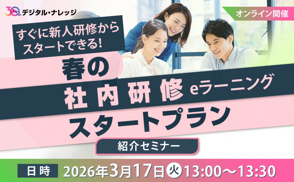 導入実績3,000社を超えるeラーニング専門ソリューション企業、株式会社デジタル・ナレッジ(本社:東京都台東区、代表取締役社長:はが弘明)は、3月17日(火)に春の社内研修eラーニングスタートプラン紹介セミナーを開催いたします。