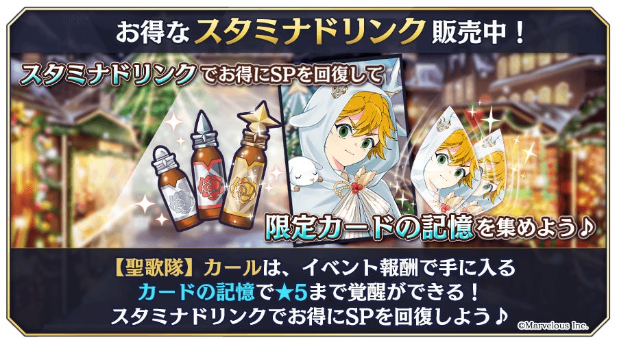 株式会社マーベラス(代表取締役社長:佐藤 澄宣/所在地:東京都品川区)による、スマートフォンゲーム『千銃士:Rhodoknight』(読み:せんじゅうし ろーどないと 以降、『千銃士R』)は、本日よりストーリーイベント「きらめく★Xmasのデート大作戦!?」を開催いたします。本イベントではイベント限定ストーリーが読める他、プロローグ読了で★2「カール(CV:山谷祥生)」のイベント限定カードを獲得できます。イベントにあわせて、イベント内で活躍する★3「八九(CV:鈴村健一)」の新カードがピックアップで登場する期間限定ガチャを開催いたします。