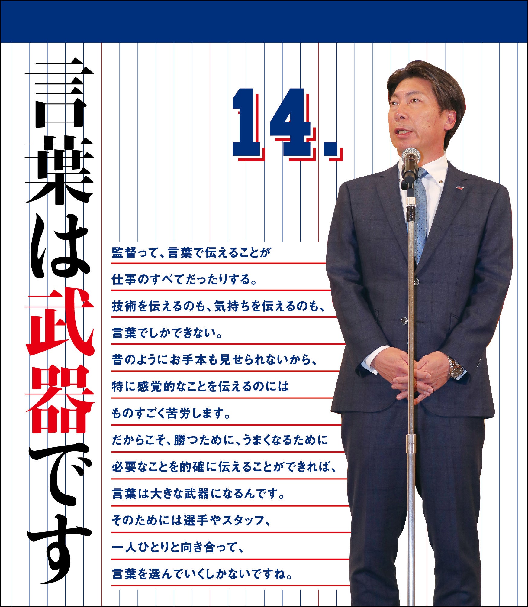 ときには選手を叱咤激励し、ときにはファンに向けて温かい言葉を発信し、2021年ヤクルトスワローズを日本一に導いた、東京ヤクルトスワローズ一軍監督、髙津臣吾氏の毎日日めくりです。