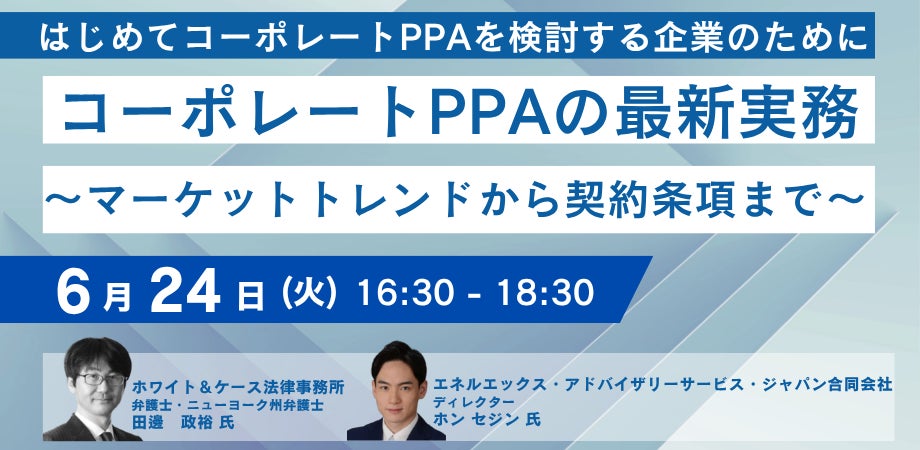 JPI(日本計画研究所)は、ホワイト&ケース法律事務所 弁護士・ニューヨーク州弁護士 田邊 政裕 氏、エネルエックス・アドバイザリーサービス・ジャパン合同会社 ディレクター ホン セジン 氏を招聘し、コーポレートPPAの最新実務について詳説いただくセミナーを開催します。