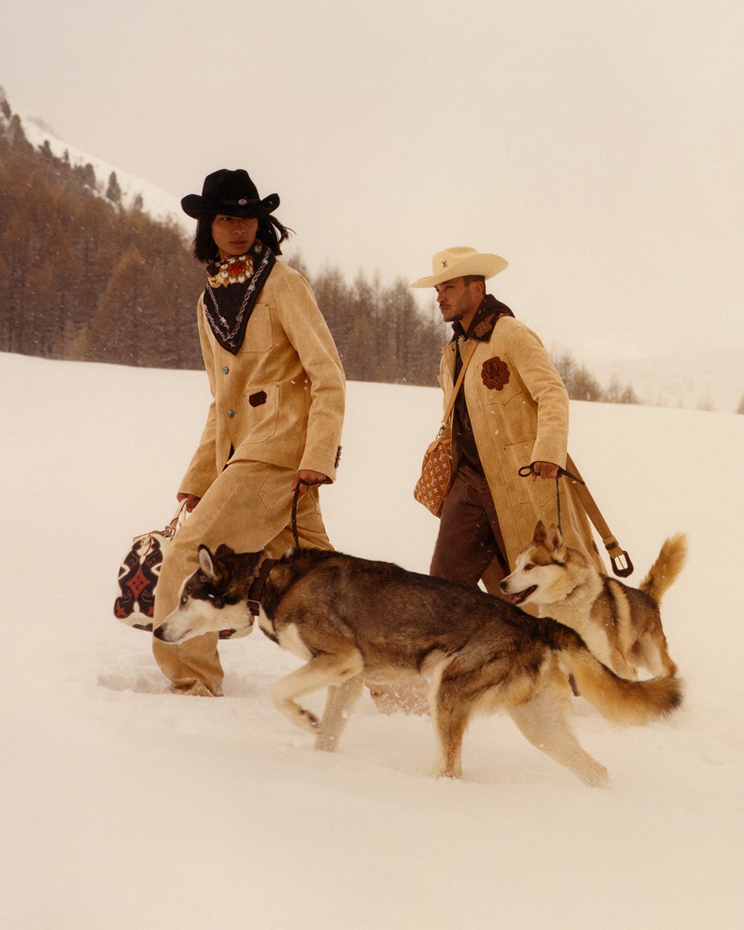 プレタポルテは、ワークウェアのオーセンティックなコードとルイ・ヴィトンの精緻なクラフツマンシップを融合。汎用性を重視し、洗練されたワークウェアのシルエットに仕立てられたオーバーダイジャカードのスーツは、ブラウンやブラック、ベージュのエレガントなトーンの中に、耐久性と洗練を兼ね備えています。アメリカン・ワークウェアの機能的なラインに忠実に、彫刻のようにボリュームのあるカッティングで仕立てられたトラッカージャケットやコートのポケットには、ウエスタン・ワードローブの特徴的なヨークやレザーのアップリケ・モチーフがあしらわれています。ターコイズ風のボタンをはじめ、パールや刺繍、スタッズなどのディテールがウェアを彩り、メゾンのサヴォアフェール(匠の技)を繊細に表現しています。