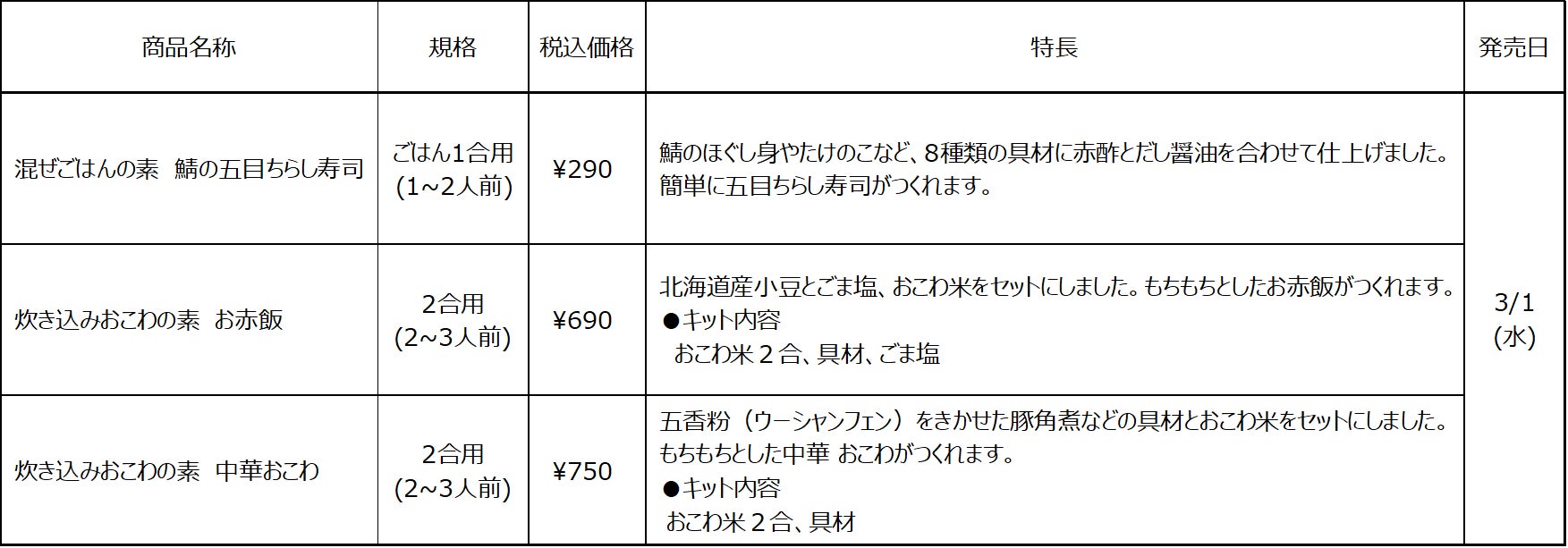 無印良品を展開する株式会社良品計画(東京都豊島区/代表取締役社長 堂前 宣夫)は、毎日の食卓に欠かせないごはんで季節を彩る新シリーズとして、炊いたごはんに混ぜるだけの「混ぜごはんの素」1アイテムと、もち米とうるち米のブレンド米と具材がセットになった「炊き込みおこわの素」2アイテムを3月1日(水)から全国の無印良品(一部店舗を除く)とネットストアで発売します。