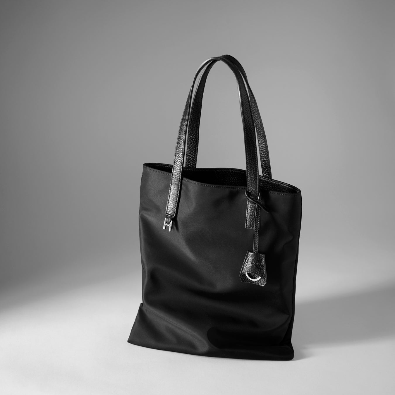 HIROFUの定番革素材ソフトバケッタリナータをボトム部分やハンドル部分使用し、見た目の上品さと耐久性を併せ持ったデザインが特徴で、さり気なく輝くシルバーのロゴと革製のキーチャームがシンプルなデザインに華を添えます。