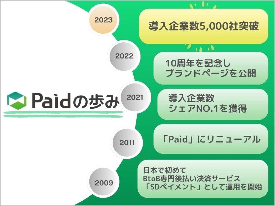 「Paid」は、企業間取引における後払い決済で発生する与信管理や請求書の発行、代金回収などの請求業務を全て代行するフィンテックサービスです。2009年に日本で初めてのBtoB専門決済サービス「SDペイメント」として提供を開始し、2011年に企業間決済「Paid」へとリニューアルしました。