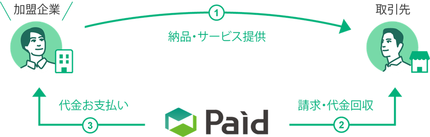 企業間取引では後払い(BNPL)決済(掛け払い/請求書払い)のニーズが高く、売上拡大に必須の決済手段です。しかし自社で後払い決済を運用するには、請求業務にかかる手間やコスト、未回収が発生するリスクといった課題があり簡単ではありません。「Paid」を導入することで、加盟企業にとっては請求業務や未入金のリスクがなくなり、取引先企業はキャッシュフローが安定するメリットがあります。決済にかかる負担をなくし、取引だけに集中できる環境を「Paid」は創出しています。2023年10月に開始される「適格請求書等保存方式(インボイス制度)」の要件を満たした帳票の発行にも対応します。一般社団法人Fintech協会に加盟。
