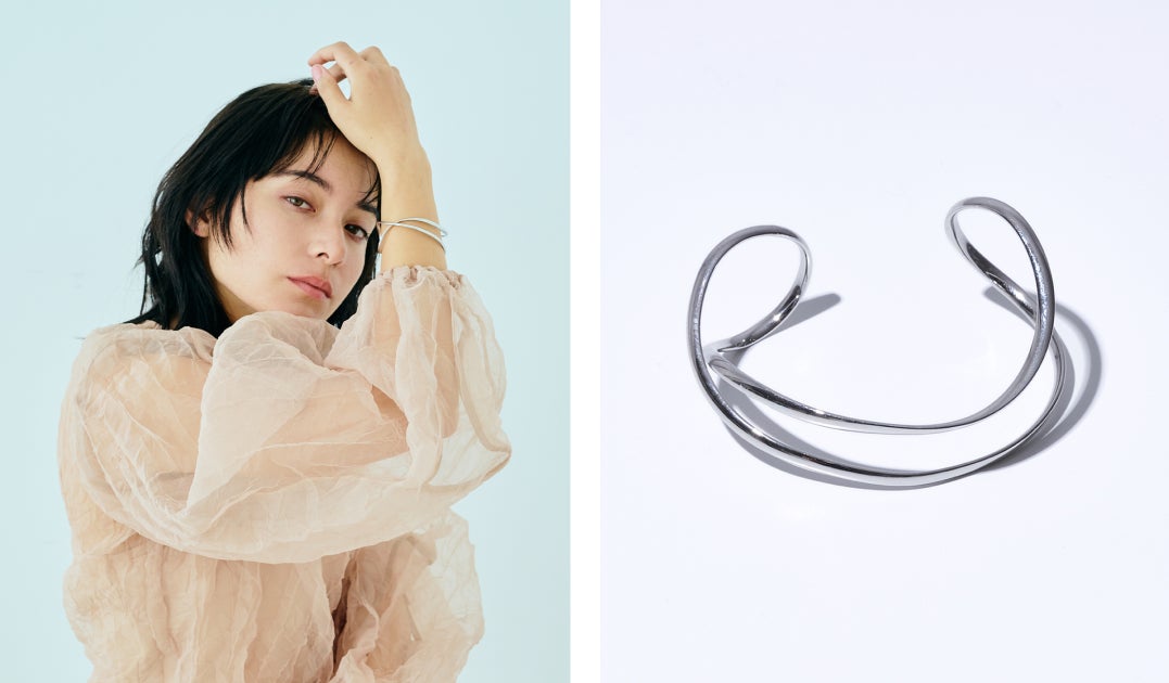 繊細な2本のラインを描くブレスレット。冬の装いでは、ニットの袖の上から着用し、コーデにメリハリをつけるのもおすすめです。