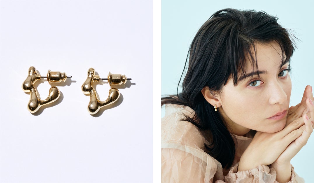 熱を持って溶けたような意匠のピアスは、さりげない大きさながら正面からだけでなく横顔も印象的に。