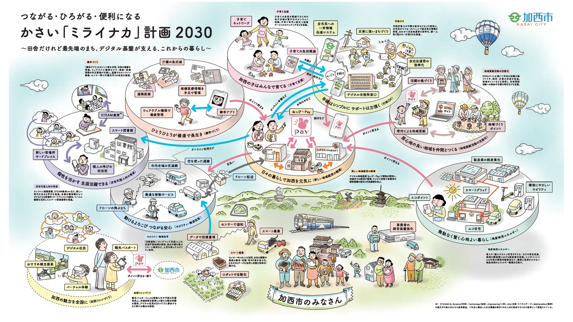 デジタル技術を活用した「人が中心の持続可能な協創のまち」の実現を目指して、加西市を舞台に、公民が連携・協創のもと最新のデジタル技術を効果的に活用することにより、地域課題を解決するとともに、活力ある豊かな市民生活を実感できる、田舎だけれど最先端のまち「ミライナカ」を具体化することを目的とする