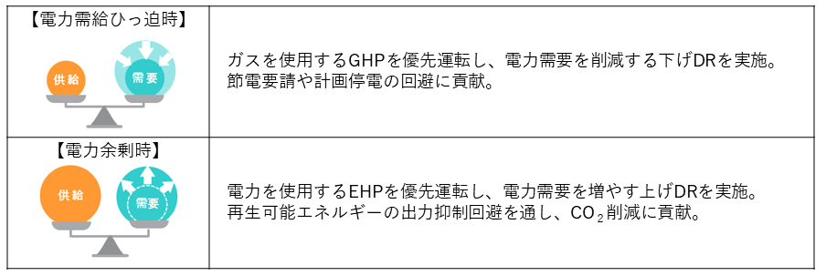 本サービスは、TGESが、スマートマルチを電力の需給バランス等に応じて自動で遠隔制御するものです。追加設備の導入や特別な操作・作業を必要とせず、空調の快適性を維持したまま、調整力を創出します。具体的には、電力需給ひっ迫時等においてはGHPを優先的に運転する「下げDR」、電力余剰時等においてはEHPを優先的に運転する「上げDR」を行うことで、需給バランスの調整に貢献するとともに、DRの実績に応じた報酬を得ることができます[*3]。