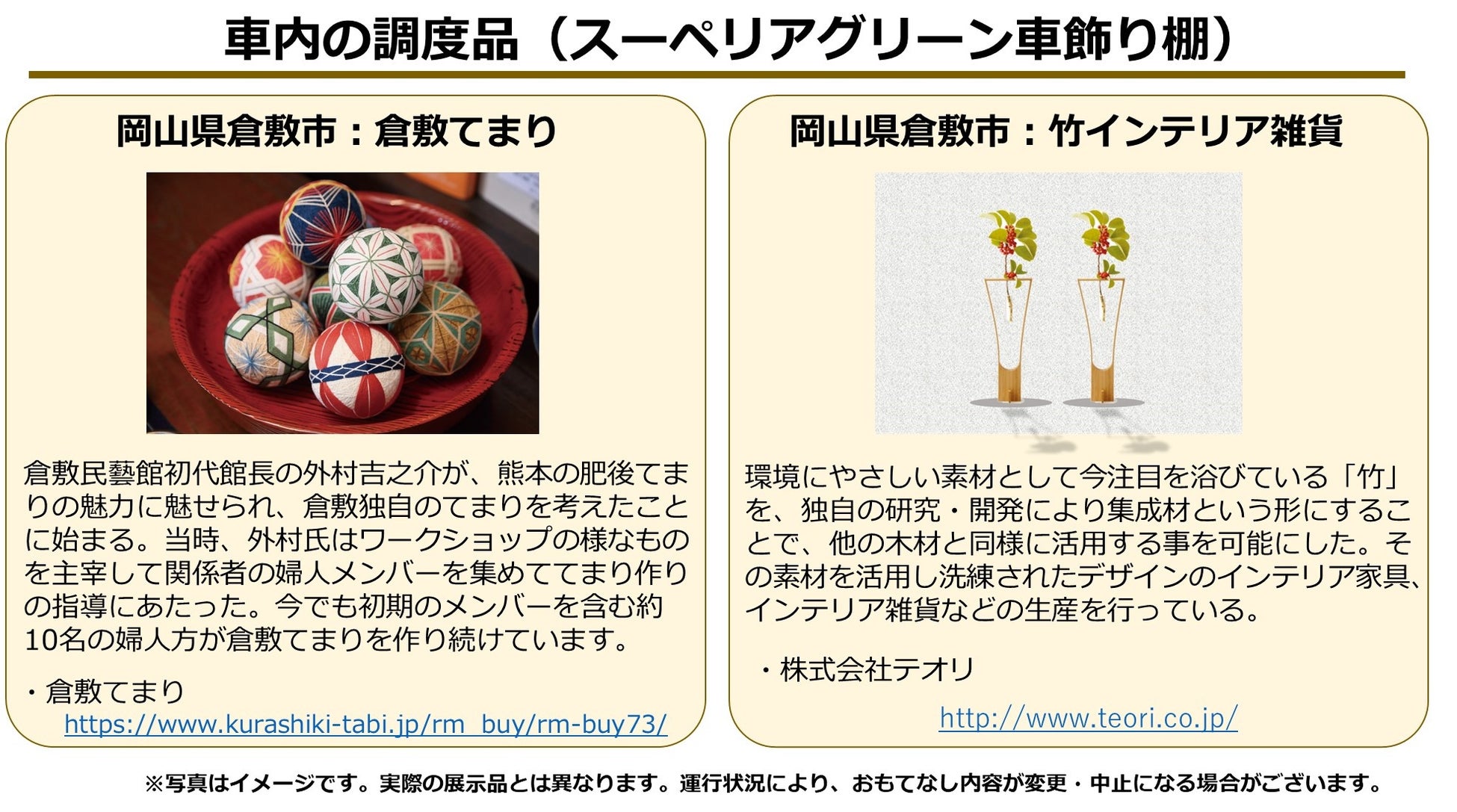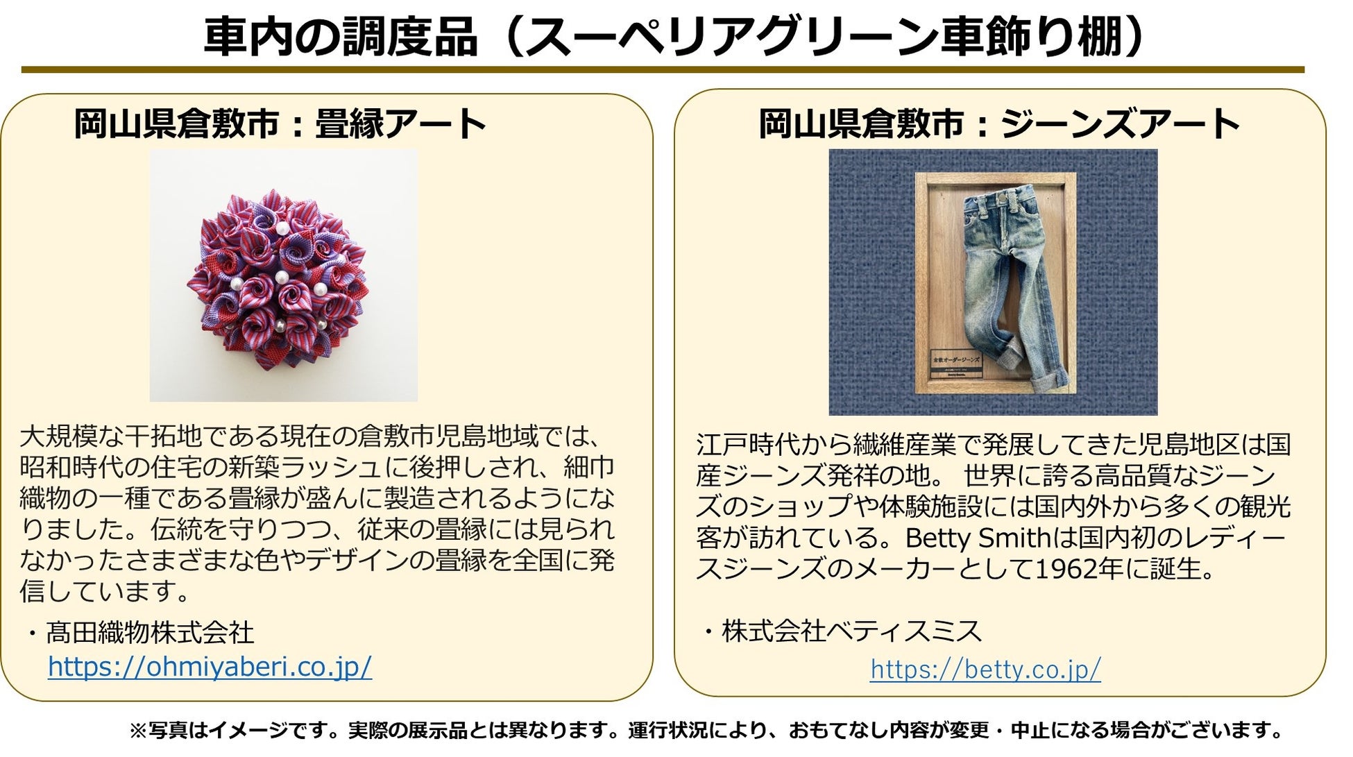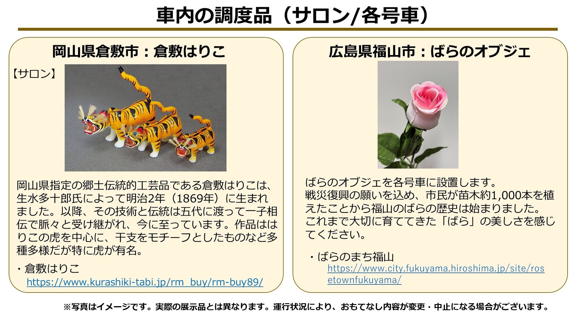 運行期間中、1号車(スーペリアグリーン車)の飾り棚などに岡山県および広島県ならではの工芸品・アート作品を展示します。