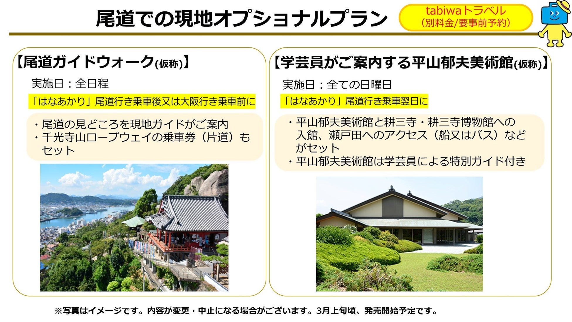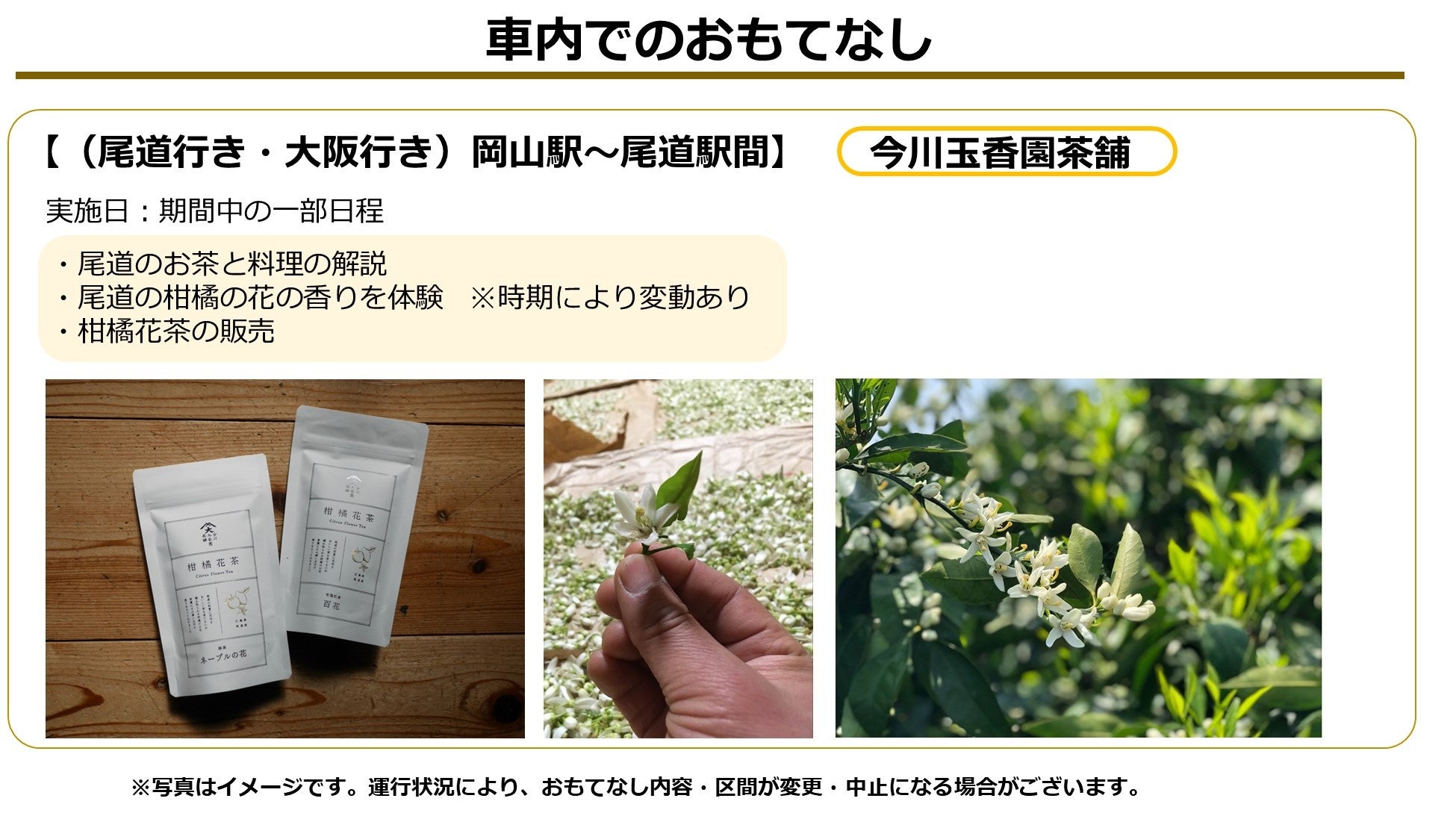 観光列車「はなあかり」は、2025年春季は大阪から倉敷・福山を経て尾道まで運行します。このたび、一部の日程で実施する駅および車内でのおもてなし、ならびに車内で展示する調度品の詳細が決まりましたのでお知らせします。