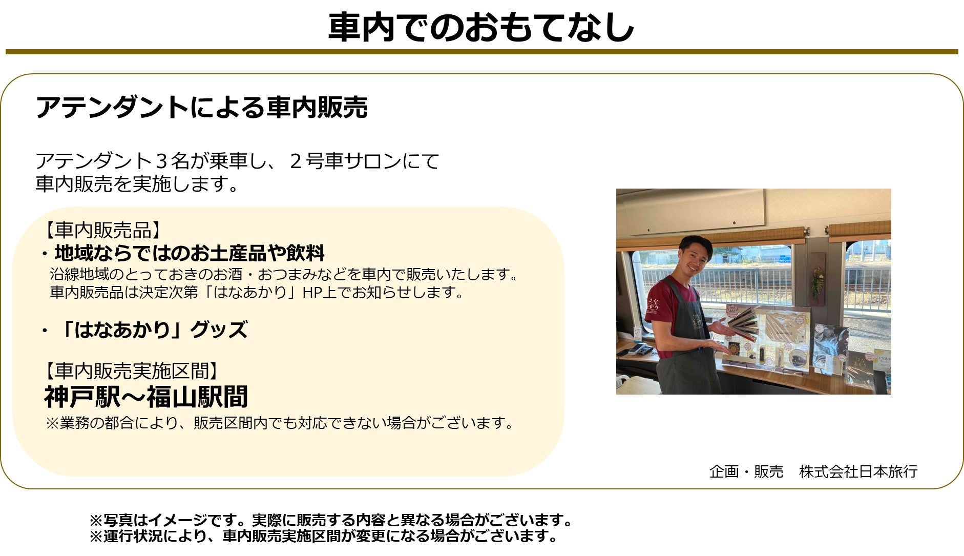 また車内にアテンダントが3名乗車し、沿線ならではのお土産品や飲料、「はなあかり」グッズを販売します。